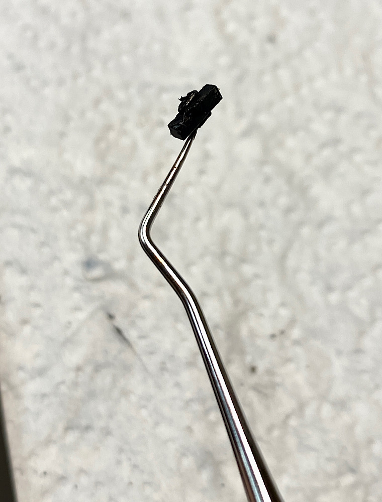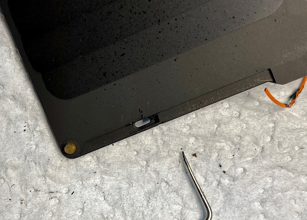 Weder mit Aceton noch mit der heißen Lötkolbenspitze bekomme ich den Schraubenkopf für den Schraubendreher frei. Alles eben, hart und glatt.
