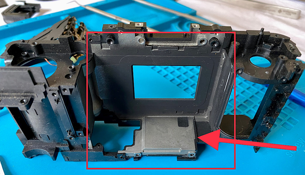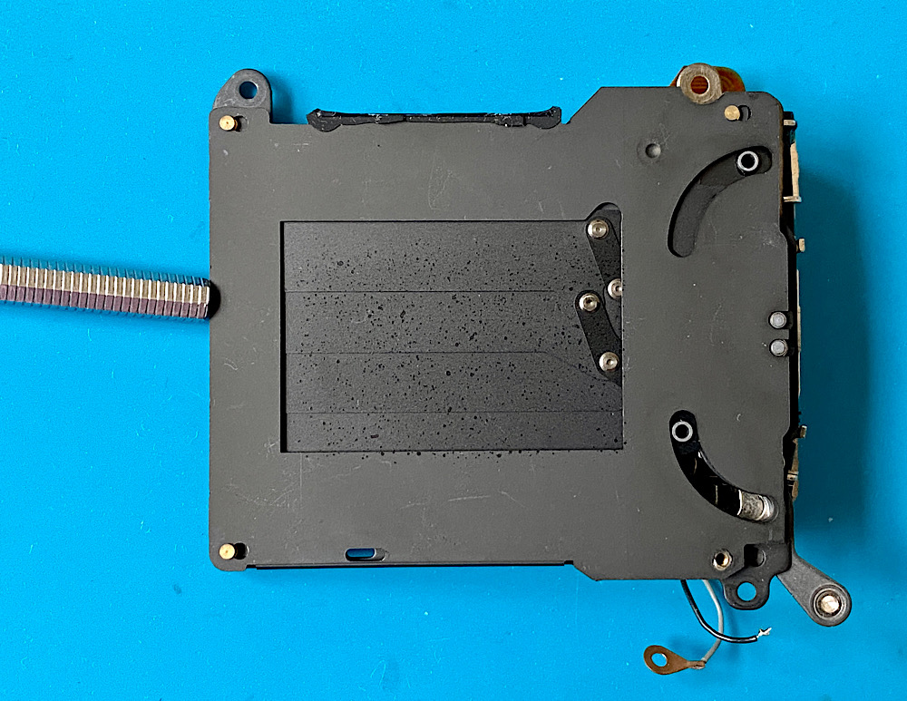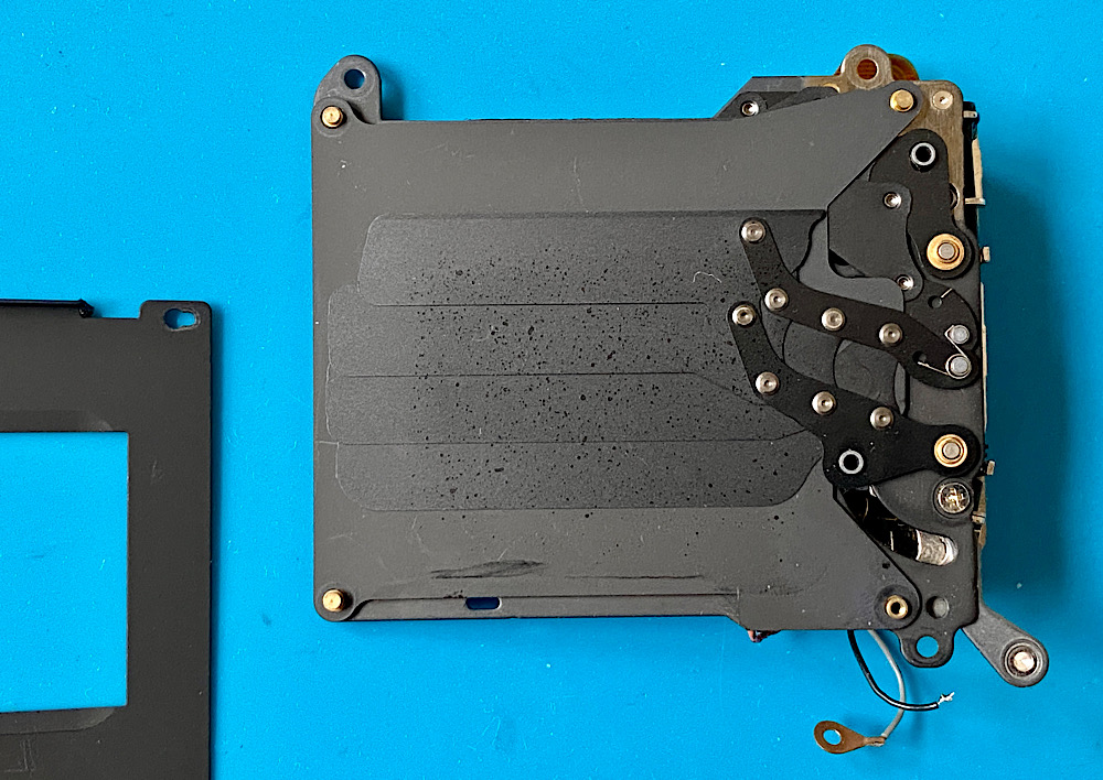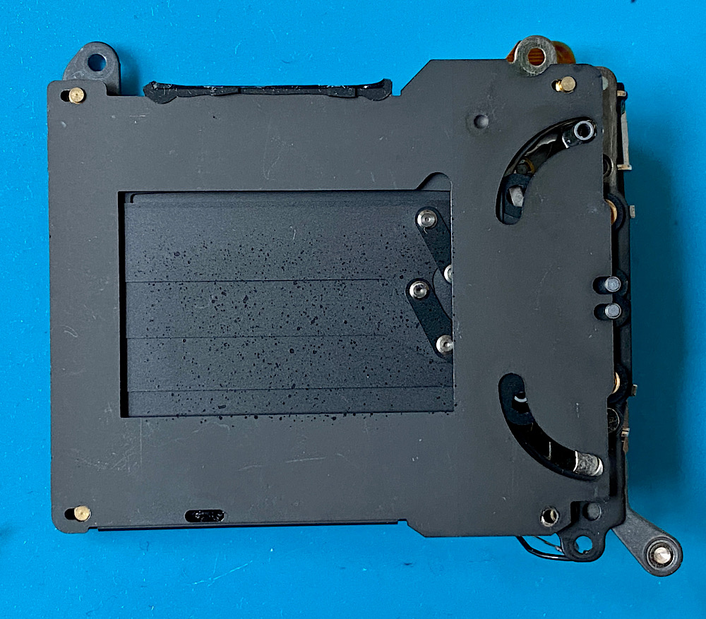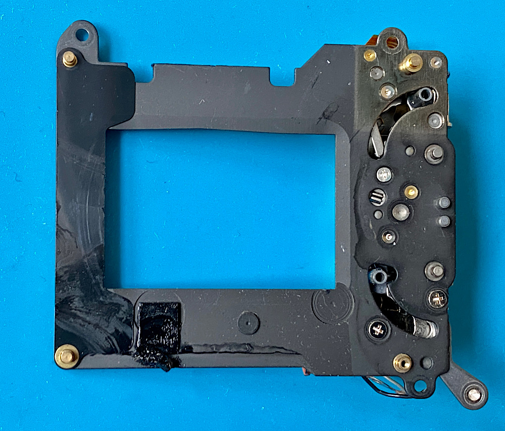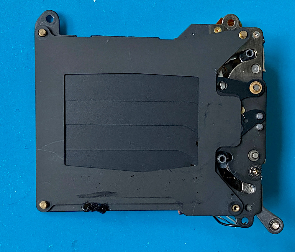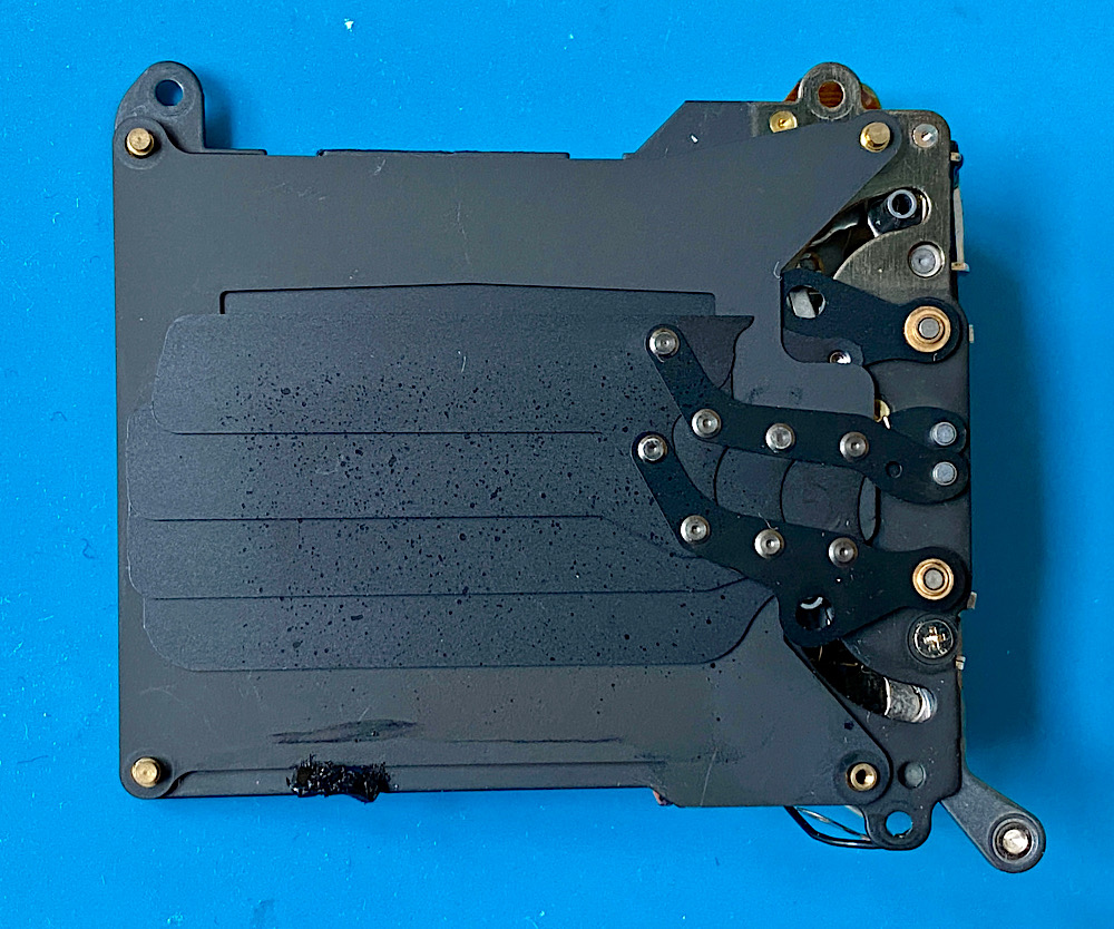 Der Boden des Verschlusses besteht aus Metall und sitzt auf einer Platte aus Druckguss im Kunststoffchassis der Kamera. Unterhalb der Lamellen ist Spielraum für die Sonde, im linken Bereich kann der Dämpfer in seiner Befestigungsöffnung wahrgenommen werden beim Bewegen der Sonde.
