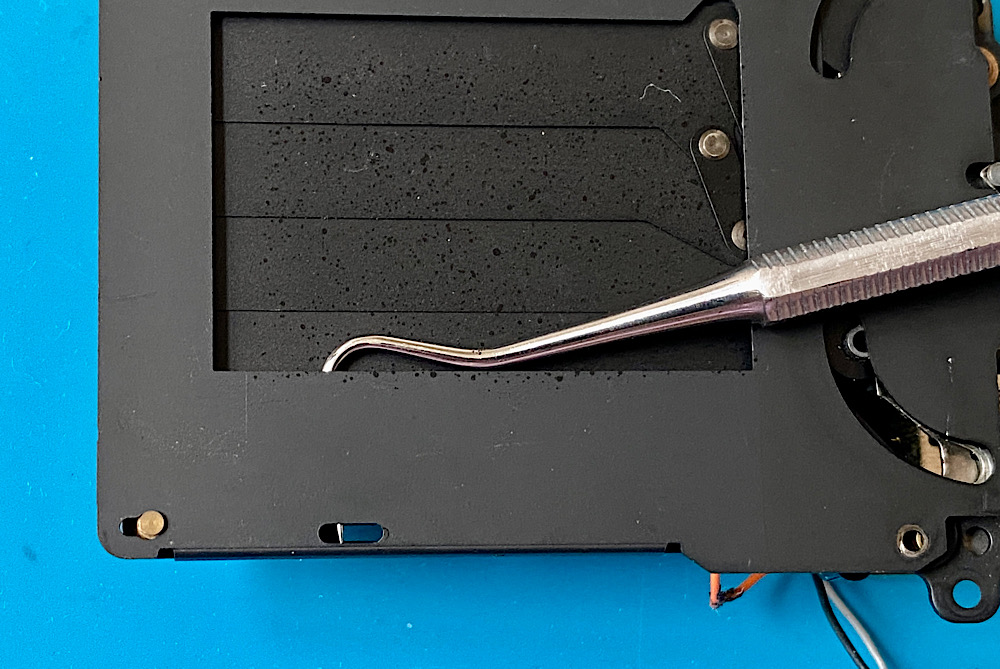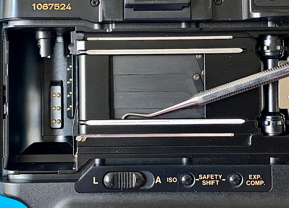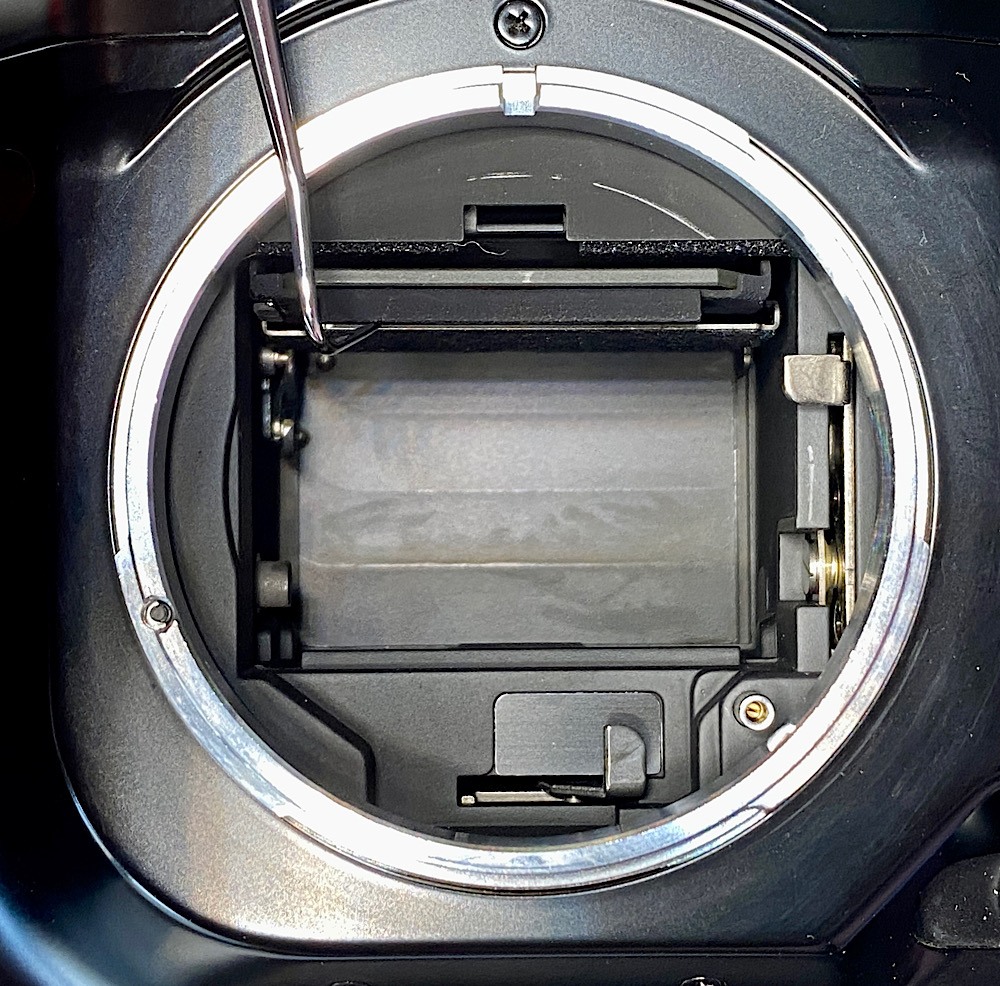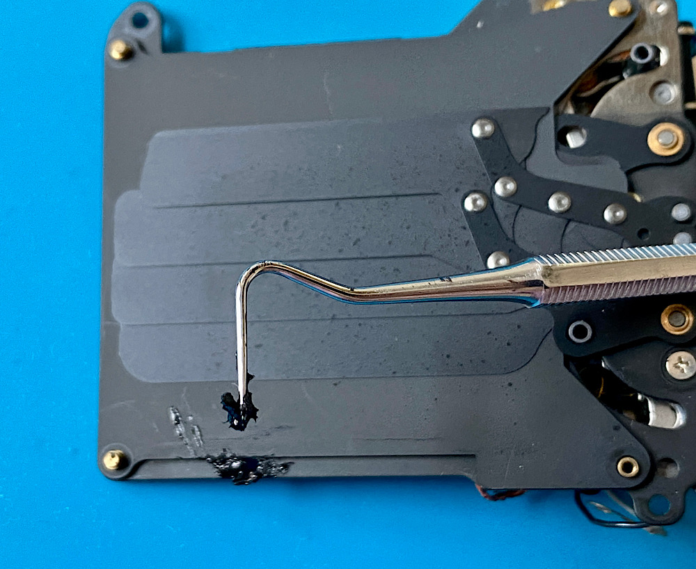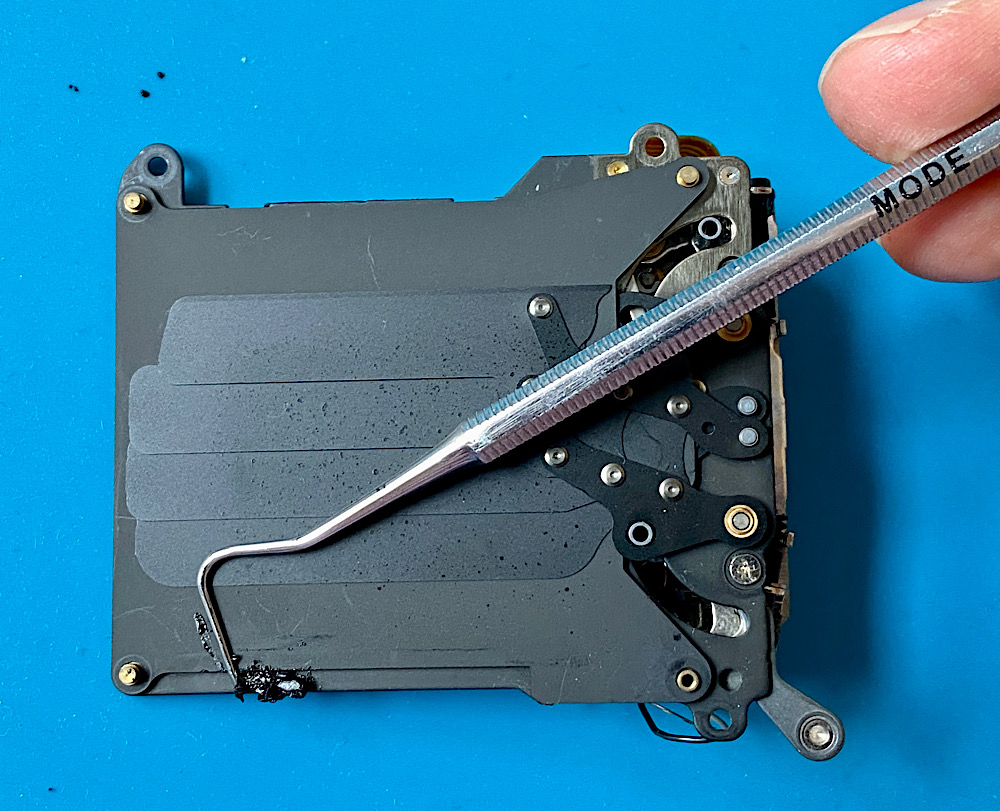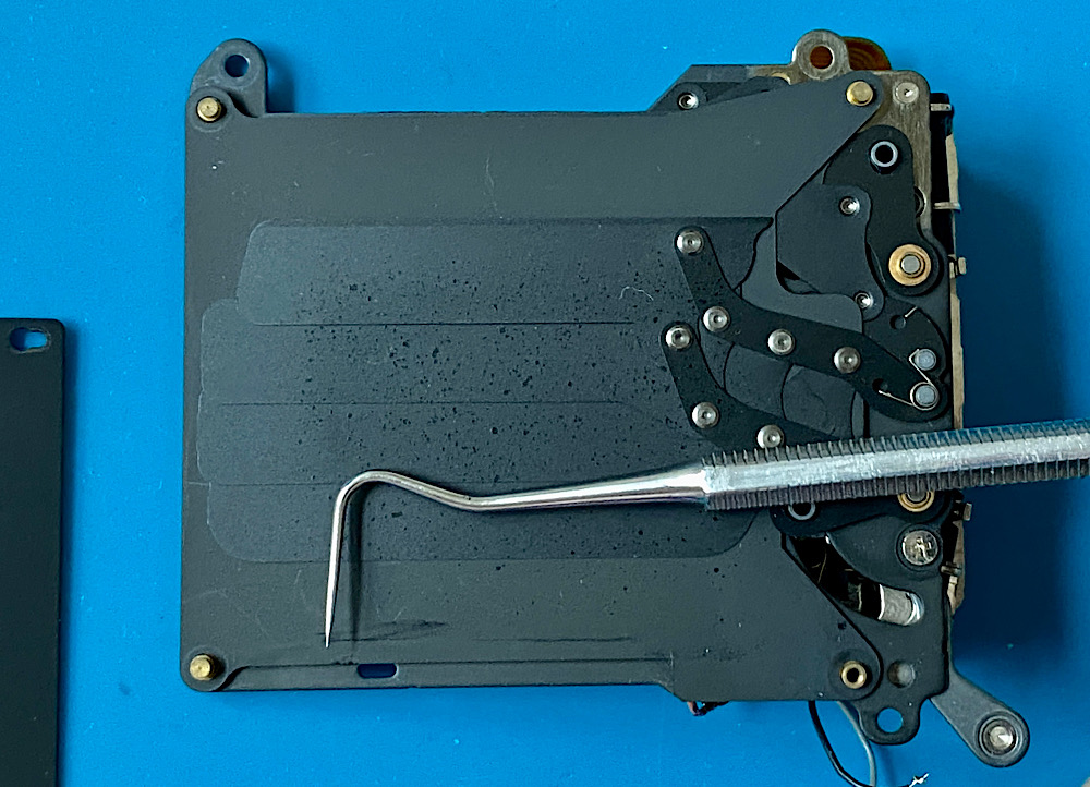 Da ich durch das Zerlegen einer T90 auch ihren Verschluss im Detail betrachten konnte, stellte ich fest, dass die Stelle, an der der Dämpfer sitzt, auch ohne Zerlegen der Kamera gut erreichbar ist. Nämlich nicht nur für in Wundbenzin getauchte Kartonstreifen zur Säuberung, sondern auch für eine abgewinkelte spitze Sonde.