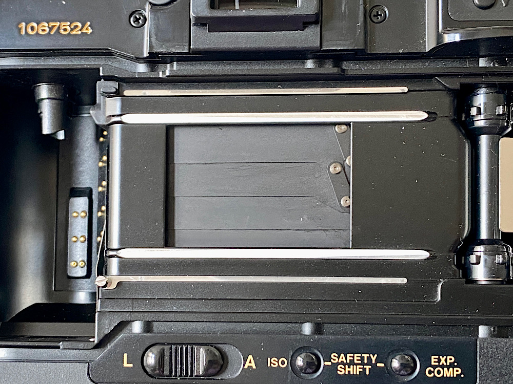 Der vertikal ablaufende Verschluss der T90 mit geschlossenen Vorhängen.