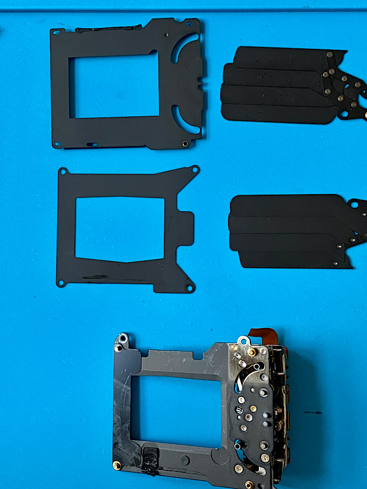 Es handelt sich gewissermaßen um ein experimentelles Vorgehen, da ich davon ausgehe, dass Aceton das hier anzutreffende Metall (Verschlusslamellen, Verschlussrahmen, Druckguss im Chassis) nicht angreift.