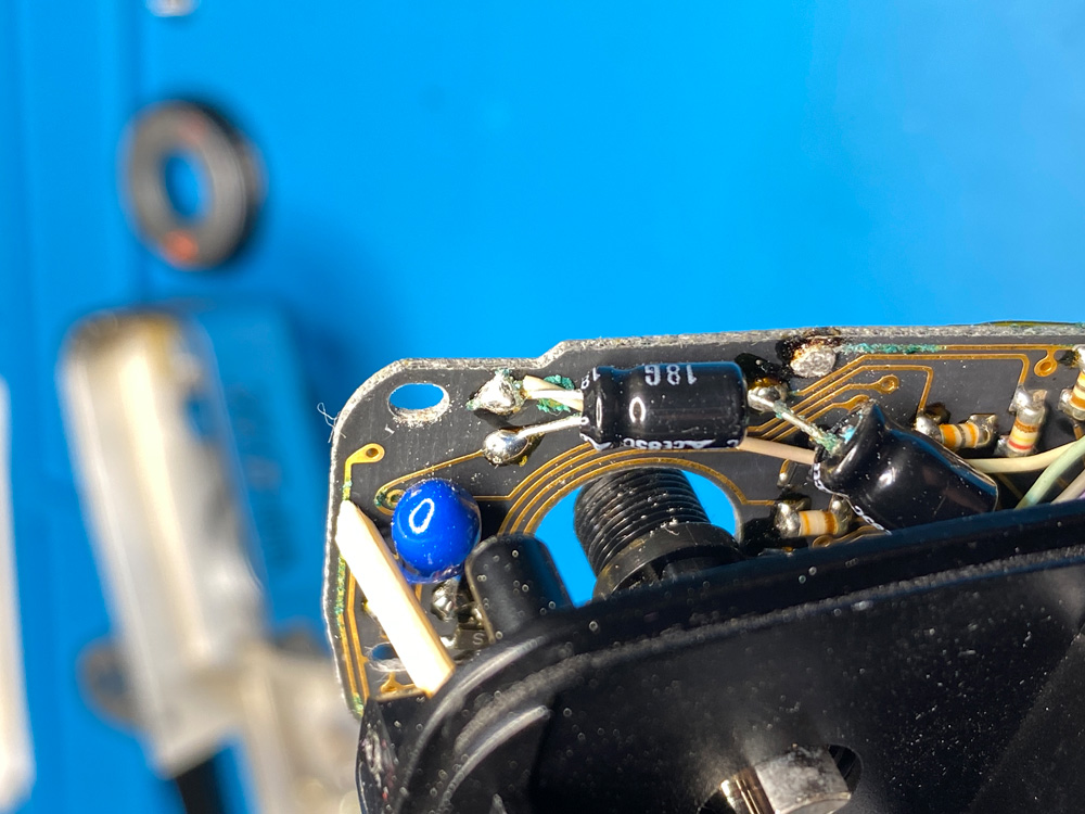 Die Säure hatte sich über das schwarze Massekabel vom Batteriefach auf die Platine ausgebreitet, und dort die Lötstelle des Kabels angegriffen.