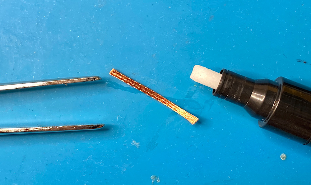 Auf einen Streifen Litze trage ich Flussmittel auf, damit Lot, Litze und Hitze gut aufeinander reagieren: