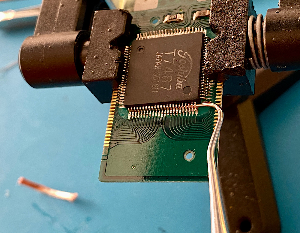 Ich setze die Lötspitze auf ein Pin, und versuche, es abzuheben. Eine dünne Lotschicht hält es noch an seinem Platz.