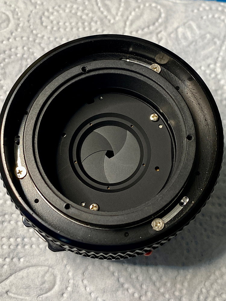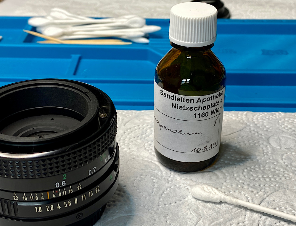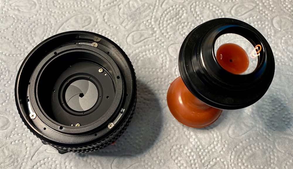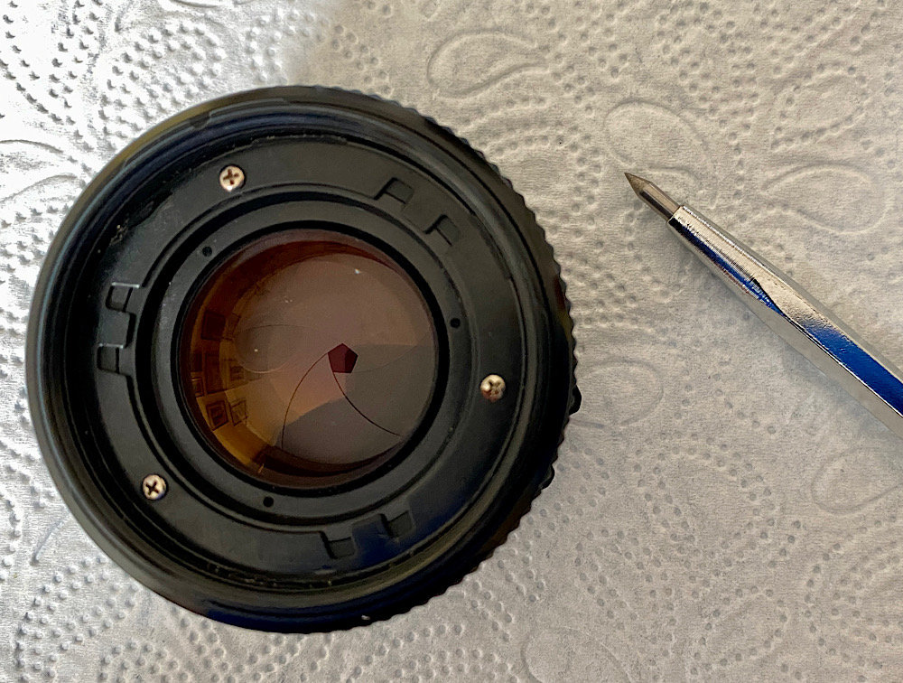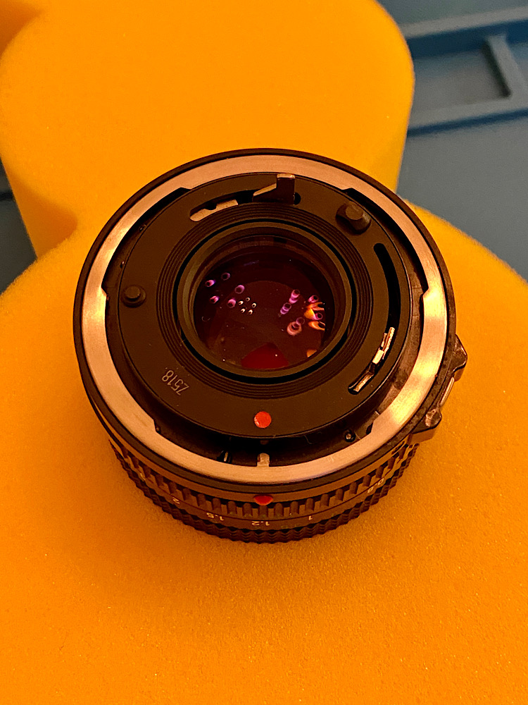 Da ich heute vorne arbeite, steht das Objektiv auf seinem Rückdeckel, der den vorstehenden Blendenhebel und die hintere Linse schützt.