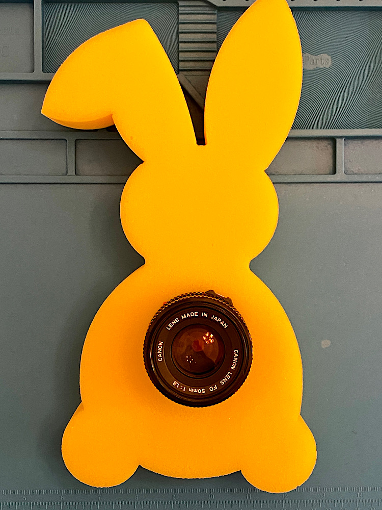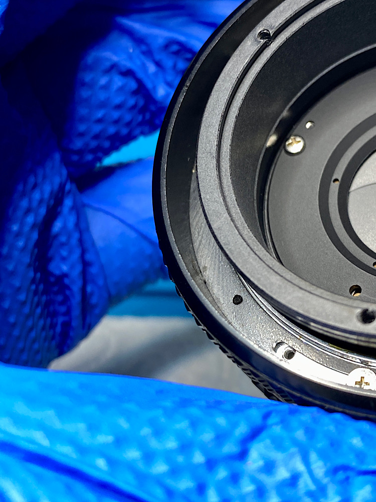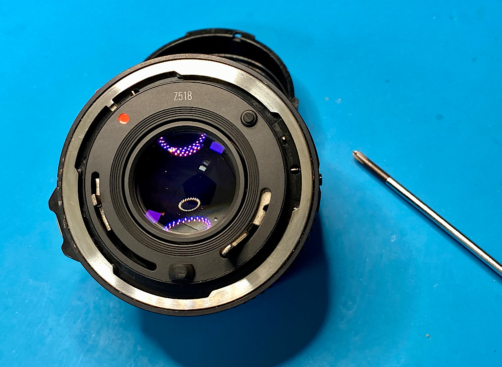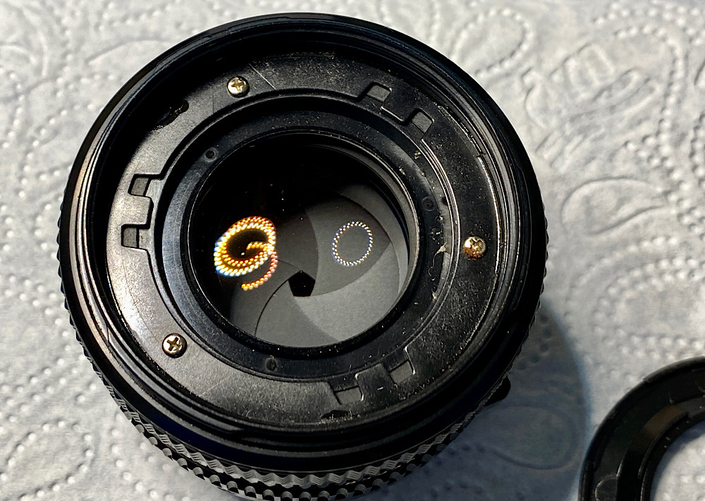 Da ich heute vorne arbeite, steht das Objektiv auf seinem Rückdeckel, der den vorstehenden Blendenhebel und die hintere Linse schützt.
