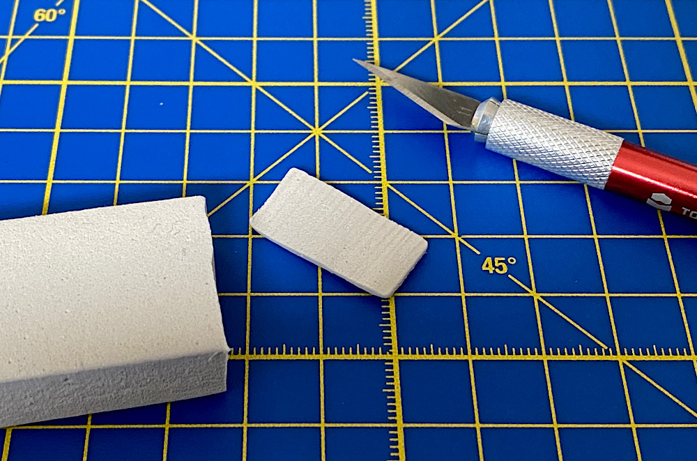 Der Zierring aus Kunststoff um die vordere Linse herum ist nicht herausdrehbar, sondern eingeklipst. Daher kann er herausgehebelt werden. Zum Schutz der Linse bei angesetzten Hebel schneide ich ein Stück von einem Block aus zähem Schaumstoff ab. Er kam einst als Teil einer Verpackung zu mir.