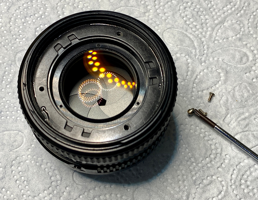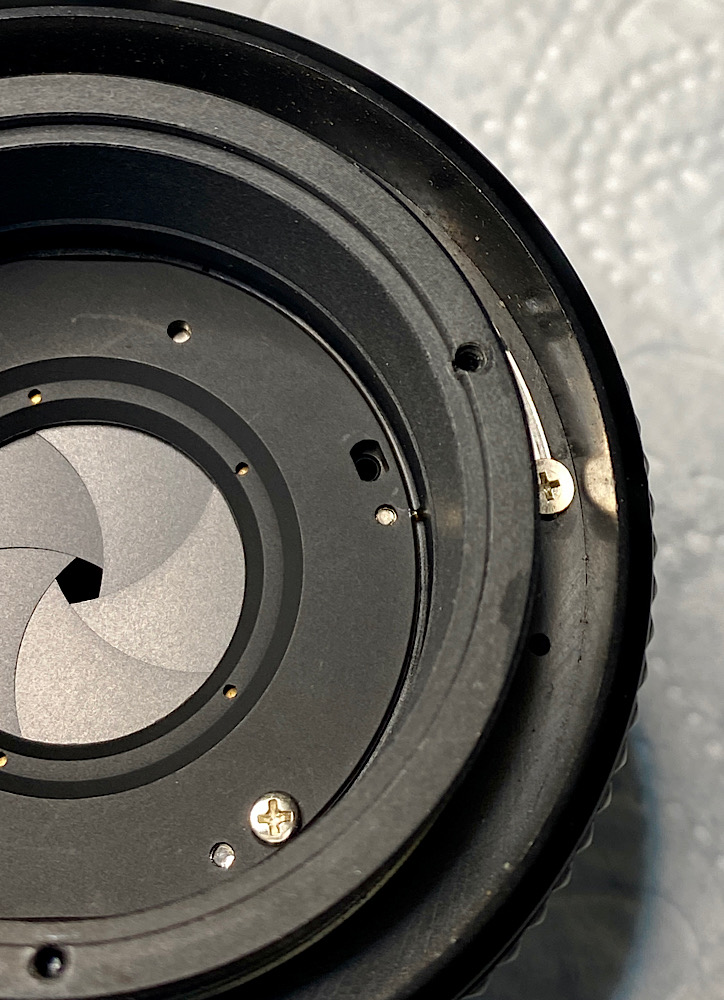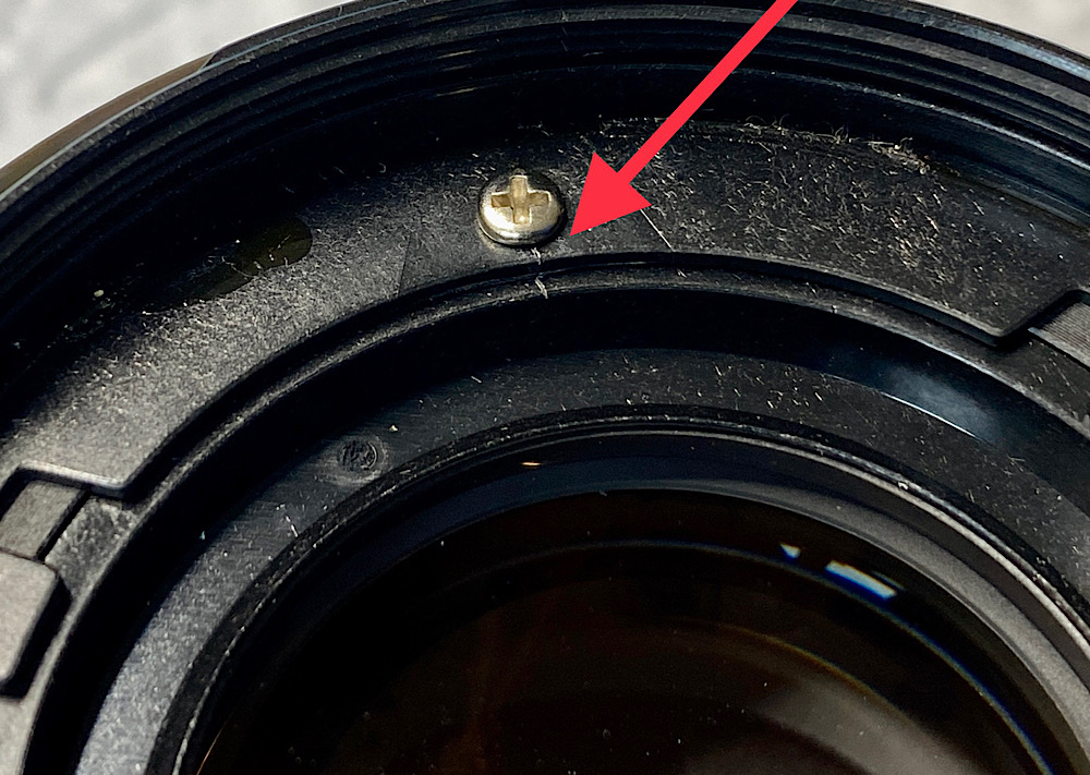 Drei Schrauben fixieren einen Ring, der die vordere Linseneinheit hält.