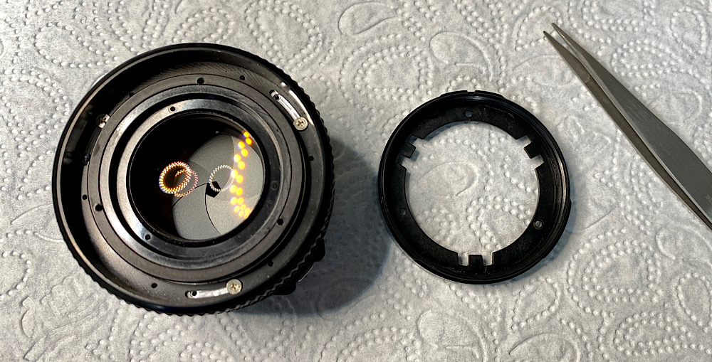 Kenneth empfiehlt, die Stellung von Ring und Linseneinheit für das Wiedermontieren zu markieren.