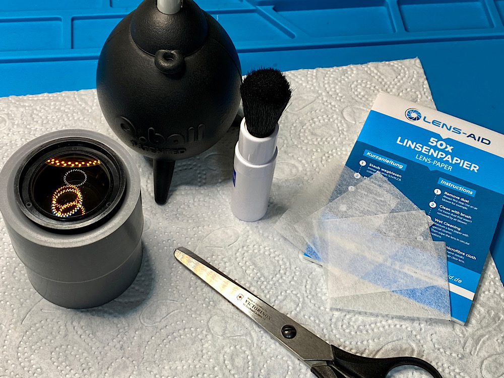 Die - kratzerfreie - Reinigung erfolgt in der Reihenfolge Blasebalg - Pinsel - Blasebalg - Linsenreinigungspapier, aber dieses …
