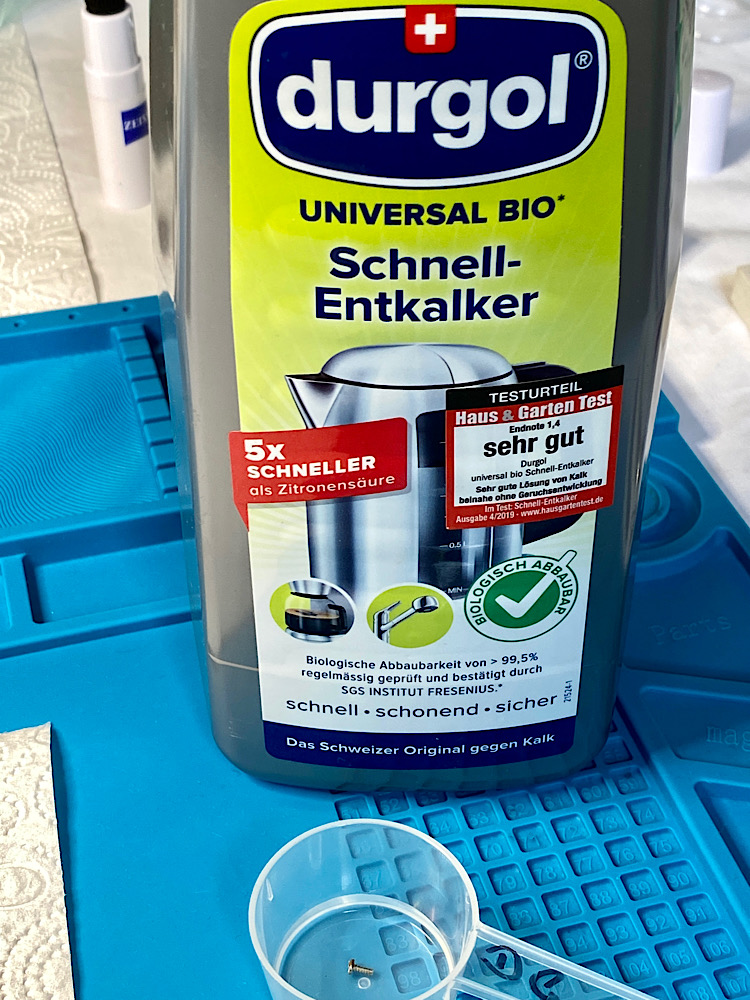 Durgol Entkalkerlösung pur, Abschaben und Spülung in Aqua Purificata sind die Kur.
