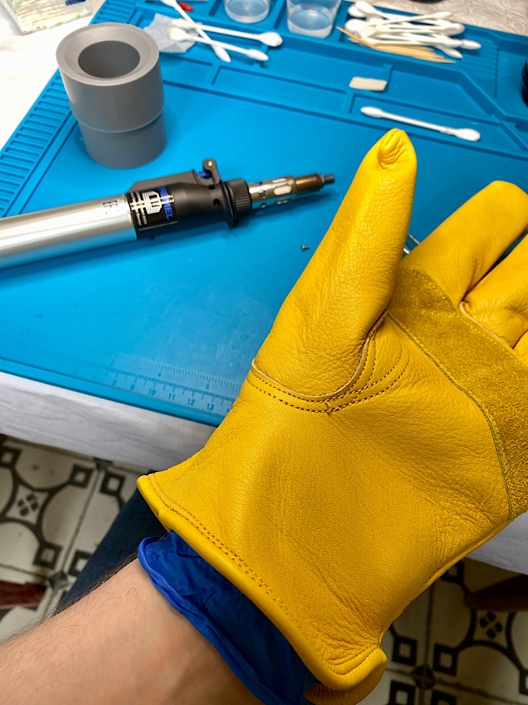 Da ich meine enganliegenden Handschuhe aus Nitril - brennbar - nicht ablegen möchte, gibts Schutzhandschuhe aus Leder drüber.
