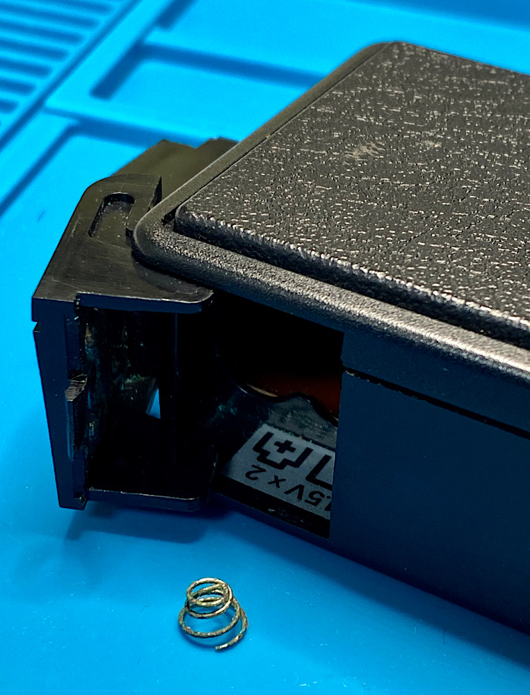 Diese, von der Batteriesäure gefällte, Kontaktfeder fiel mir aus dem Batteriefach entgegen.