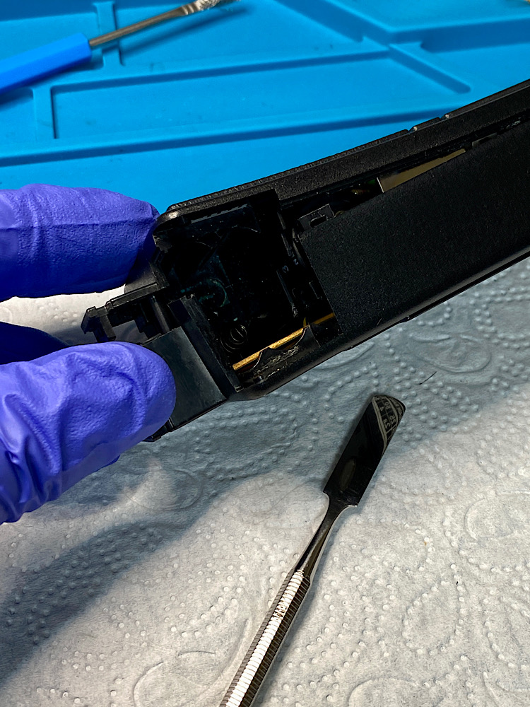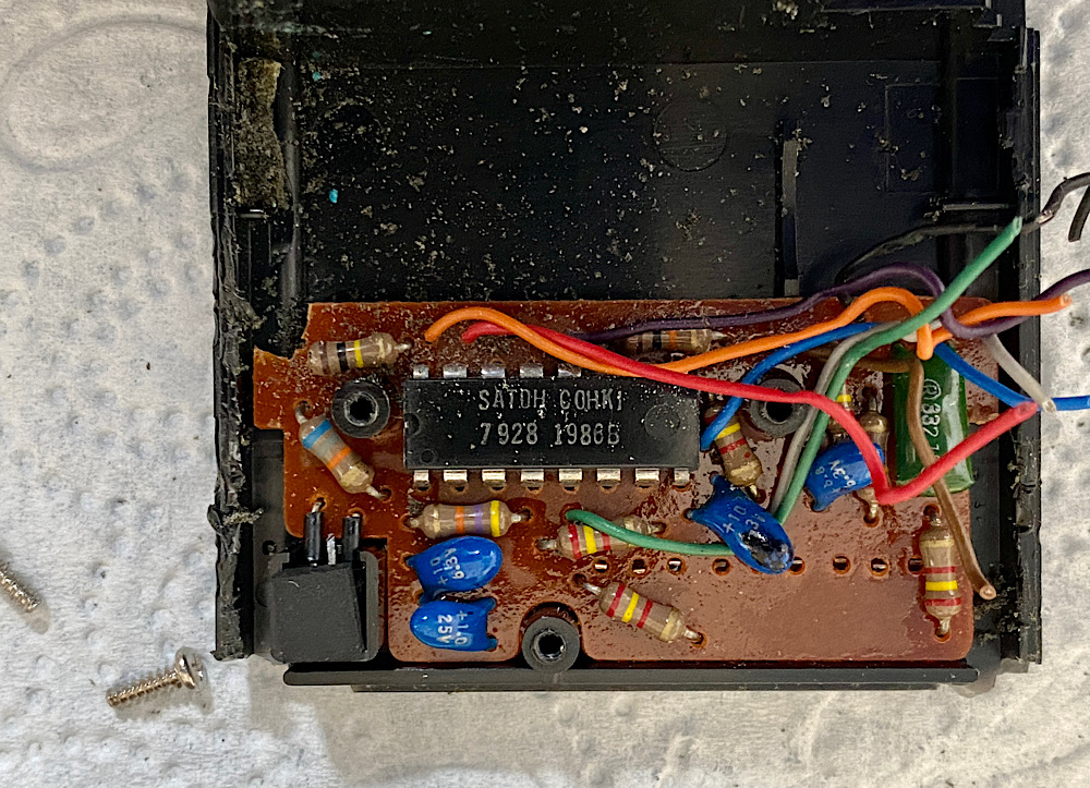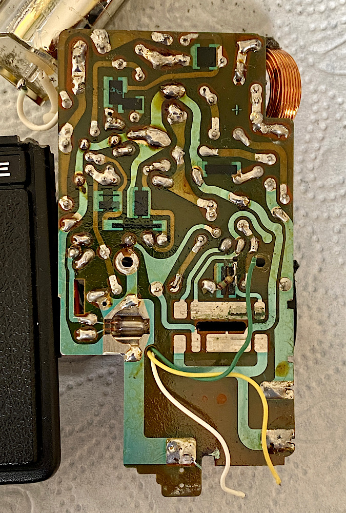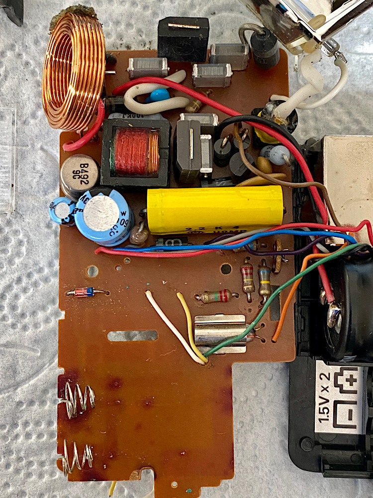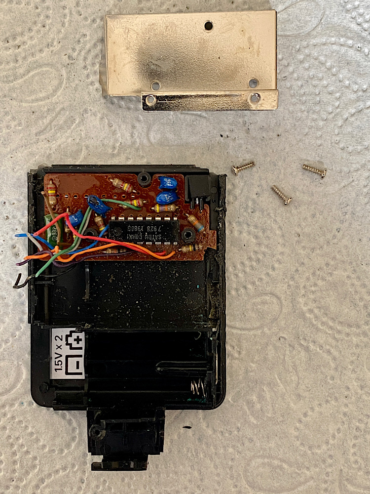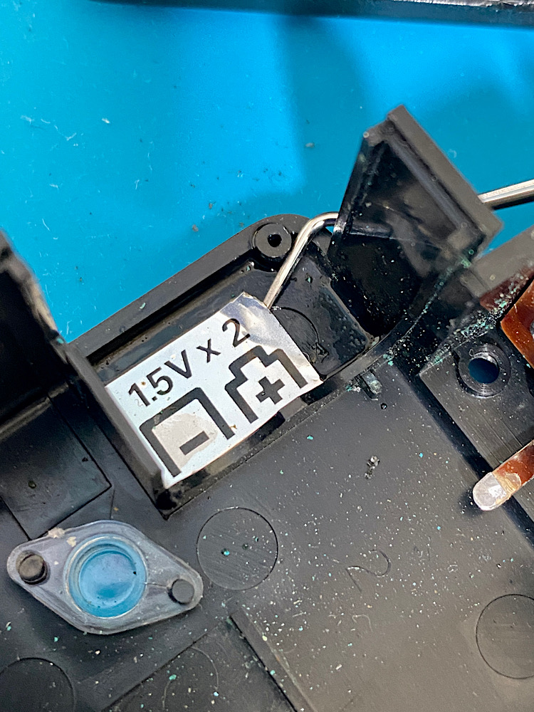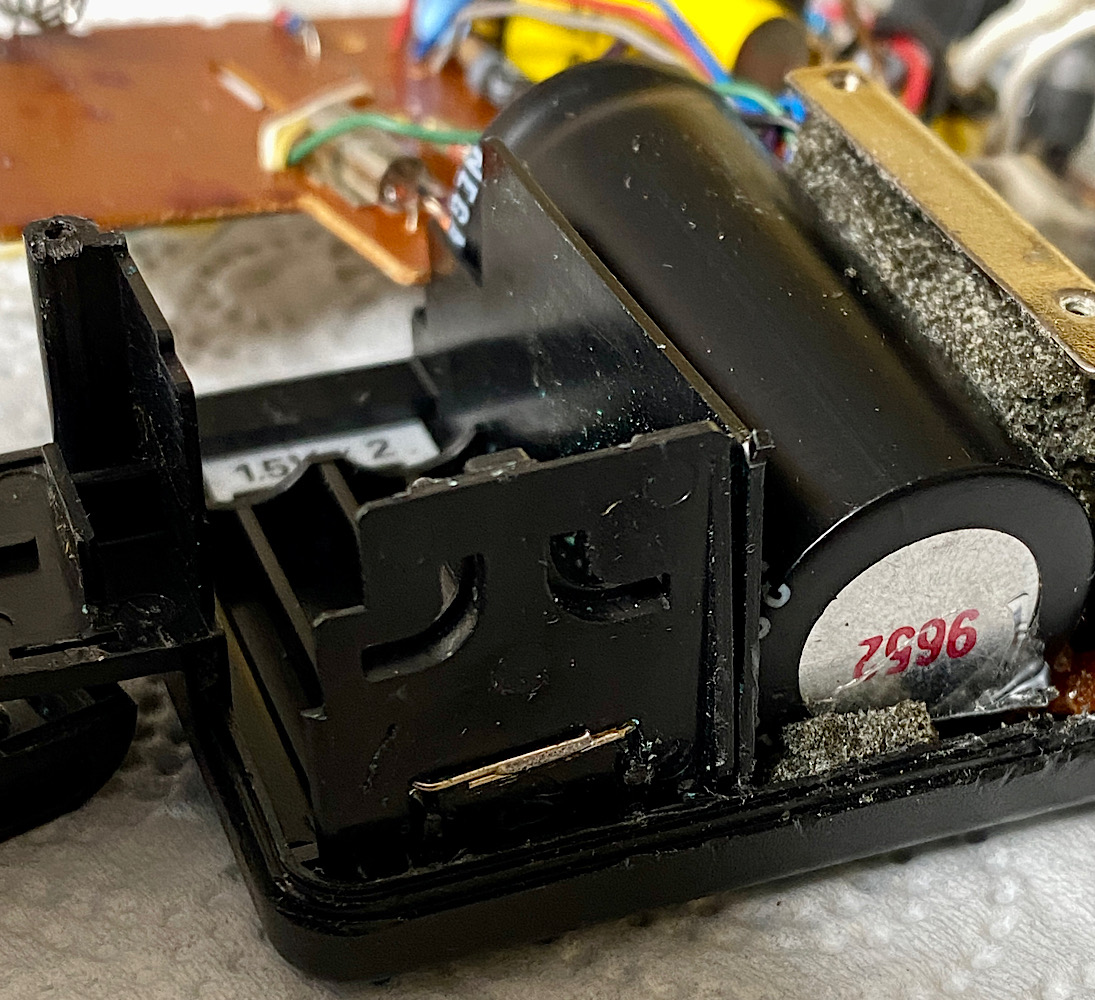 Ein Batteriesäureschaden im Batteriefach ließ auf eine größere Säuberungsaktion hinter den Batteriekontakten hoffen, mit Flick- und Lötarbeit auf der Platine.