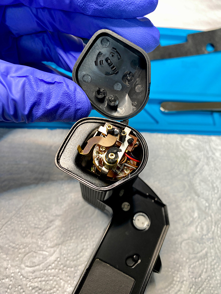 Gehalten wird der untere Teil noch vom Betriebsmodusschalter mit zwei Schrauben.