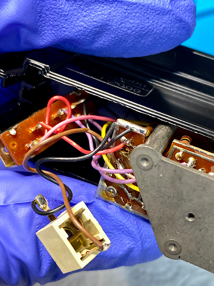 Nun ist der untere Gehäuseteil nur mehr über die Verkabelung der Buchse und eine Schraube am Betriebsmodusschalter verbunden.