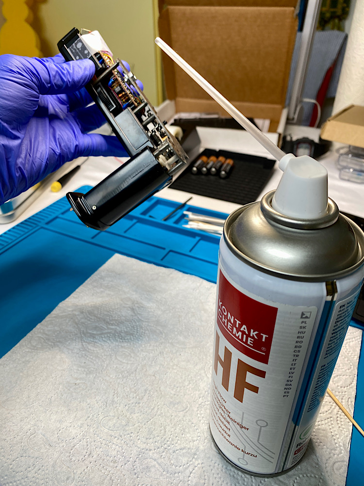 Die korrodierte Stelle hinter dem Batteriekontakt behandle ich mit Durgol-Entkalkerlösung, die die Säurereste nach ca. 15 Minuten ausreichend auflöst.