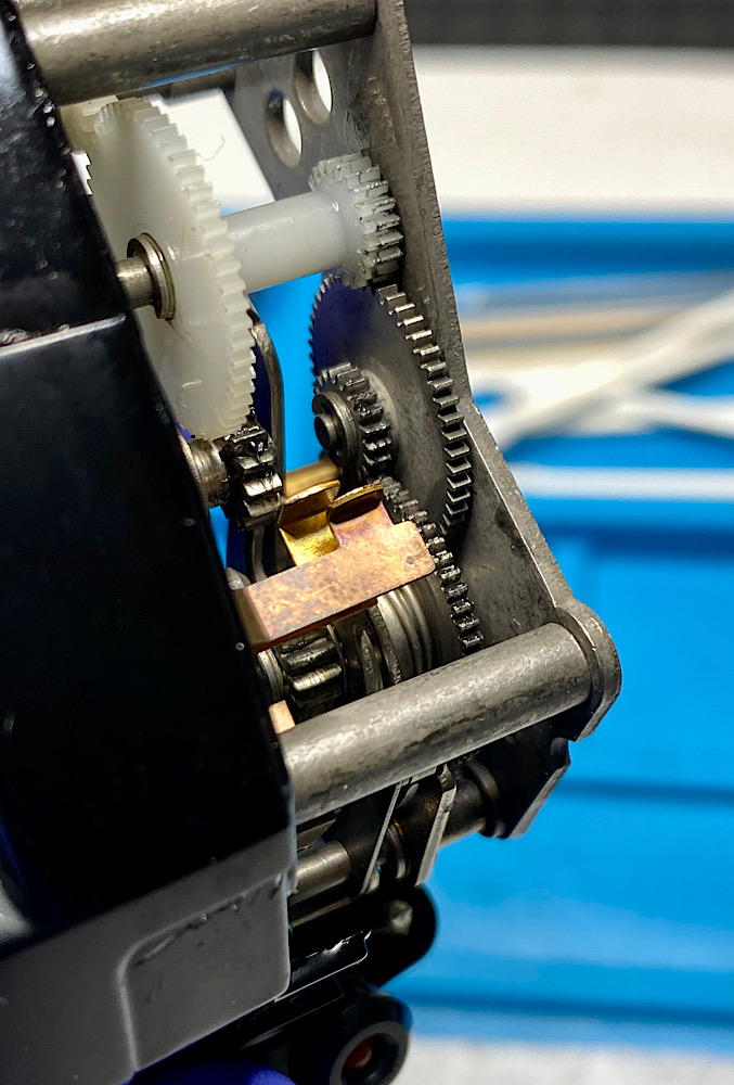 Die Zahnräder aus Kunststoff bekommen Ballistol-Silikonöl. Ebenso alle erreichbaren Achsen und Drehpunkte. Auch, wenn es durch den Verbau nicht viele sind..