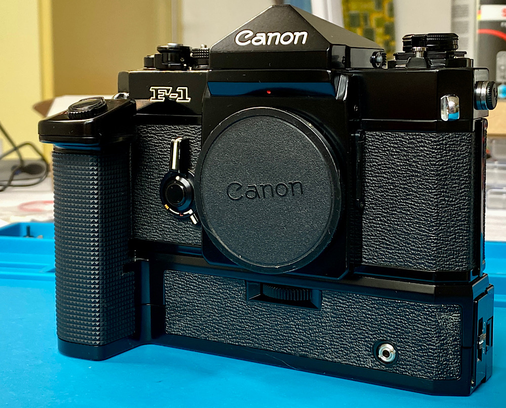 Zur Canon F-1 - die „alte“ F-1 - gibt es den Power Winder F mit Einzel- und Serienschaltung.
