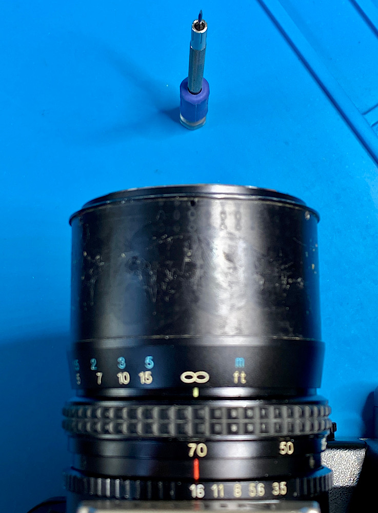 Unendlichjustierung mit einem Vessel Schlitzschraubenzieher 1,2 mm über drei Stellschrauben am Fokusring.