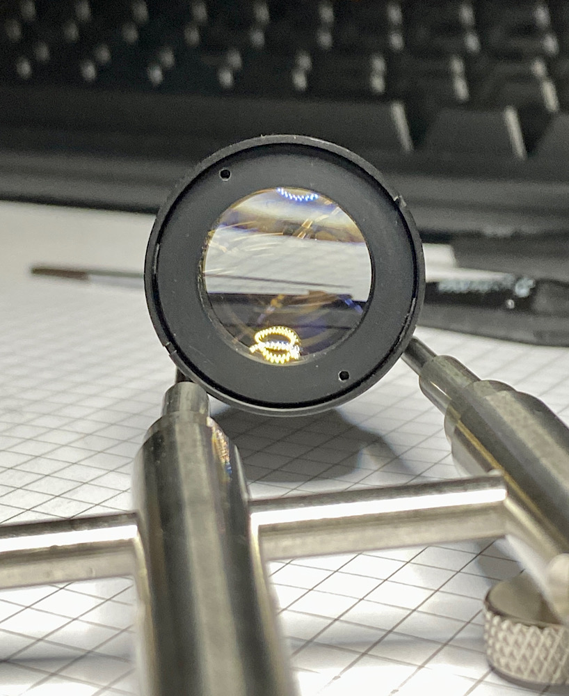 Die Bajonettschrauben lösten sich ohne Gegenwehr, auch zwei Schrauben aus dem Kragen der hinteren Linseneinheit.