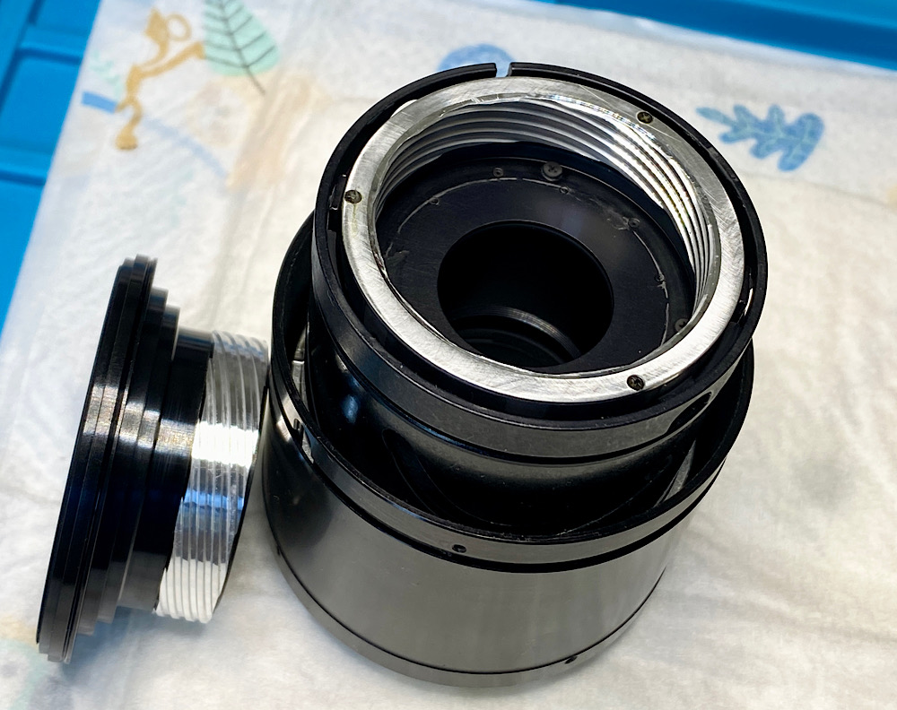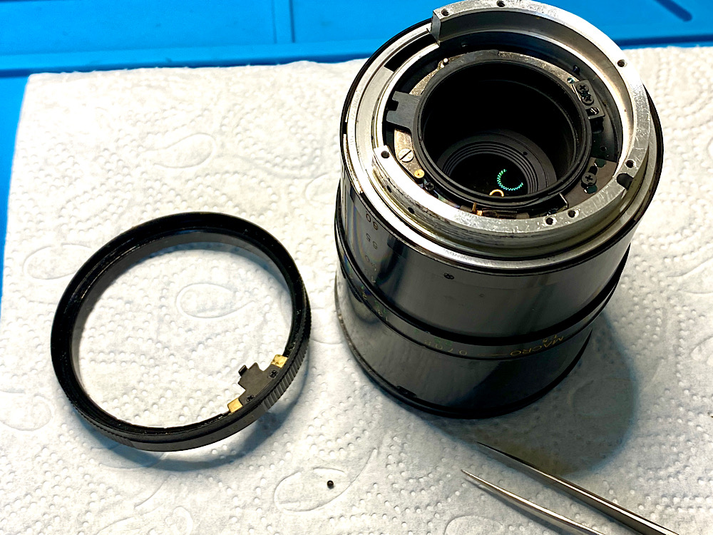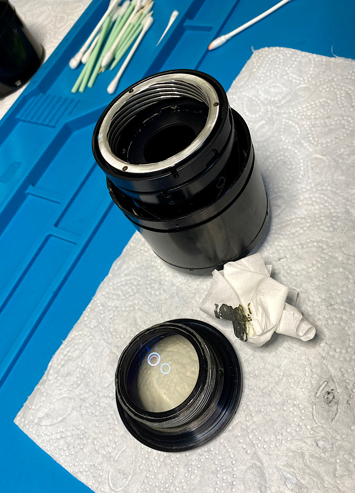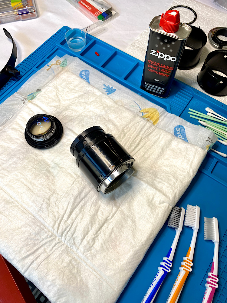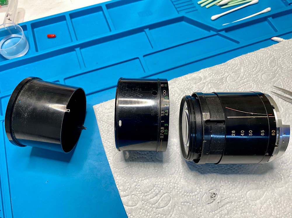 - Das Zoom ist soweit wieder sauber. Um es komplett zu reinigen, hätte ich es völlig zerlegen müssen. Darauf verzichtete ich, da - bis auf Öl - alles in annehmbaren Zustand war.