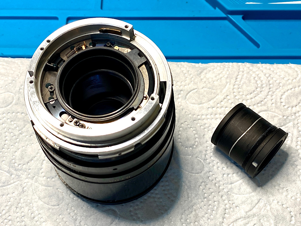 Um die vordere optische Baueinheit entnehmen zu können, muss ich mich mit dem Fokusring und seiner Kopplung mit dem vorderen Helicoid beschäftigen.