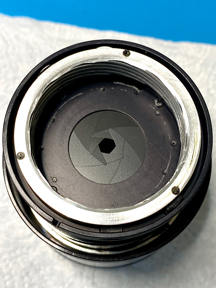 Ein Teil der Blendenmechanik und die hintere optische Baueinheit.