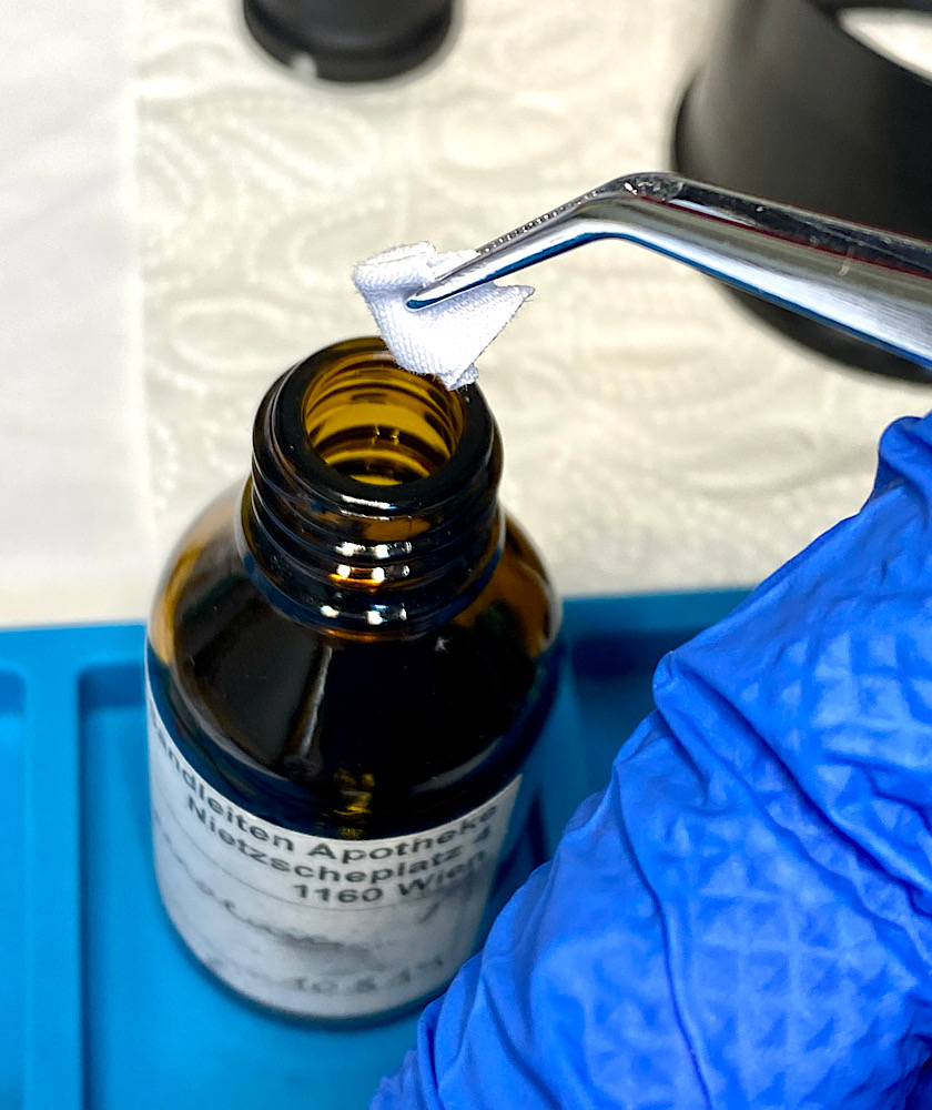 Optikreinigungstuch - wenig Isopropylalkohol - Nachwischen mit wenig Aqua Purificata.