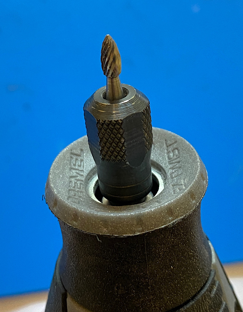 Mit dem Dremel und einem Wolframkarbid-Fräser mit Eispitze fräste ich die Schraubenköpfe ab und den oberen Teil der Bohrungen im Bajonettring aus.