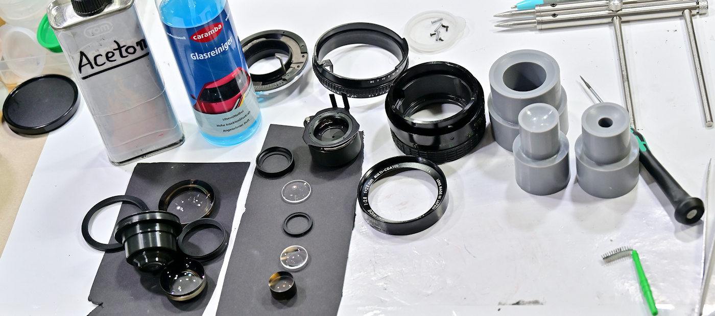 Das "Besondere" an dessen Konstruktion ist, dass die Frontlinse raus muss, damit man den restlichen Linsensatz samt Blende in einem Stück nach vorne heraus ziehen kann, nachdem man drei Schrauben im Tubus von hinten gelöst hat.