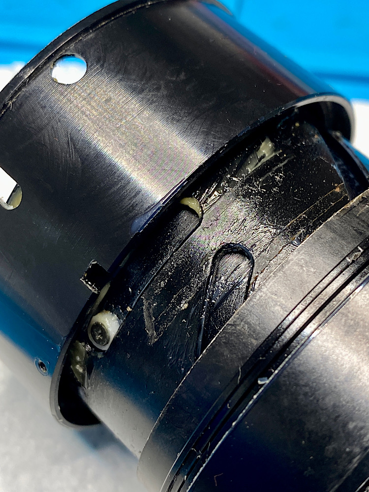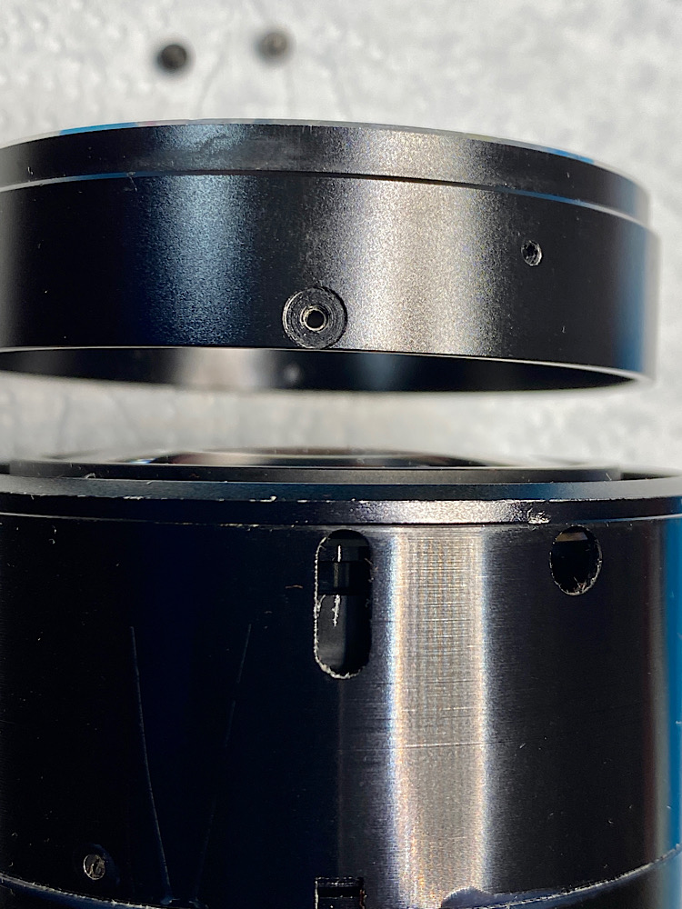 Die Kopplung des Fokusringes mit dem vorderen Helicoid zur Scharfstellung erfolgt über zwei Gleitlager und drei Schrauben.
