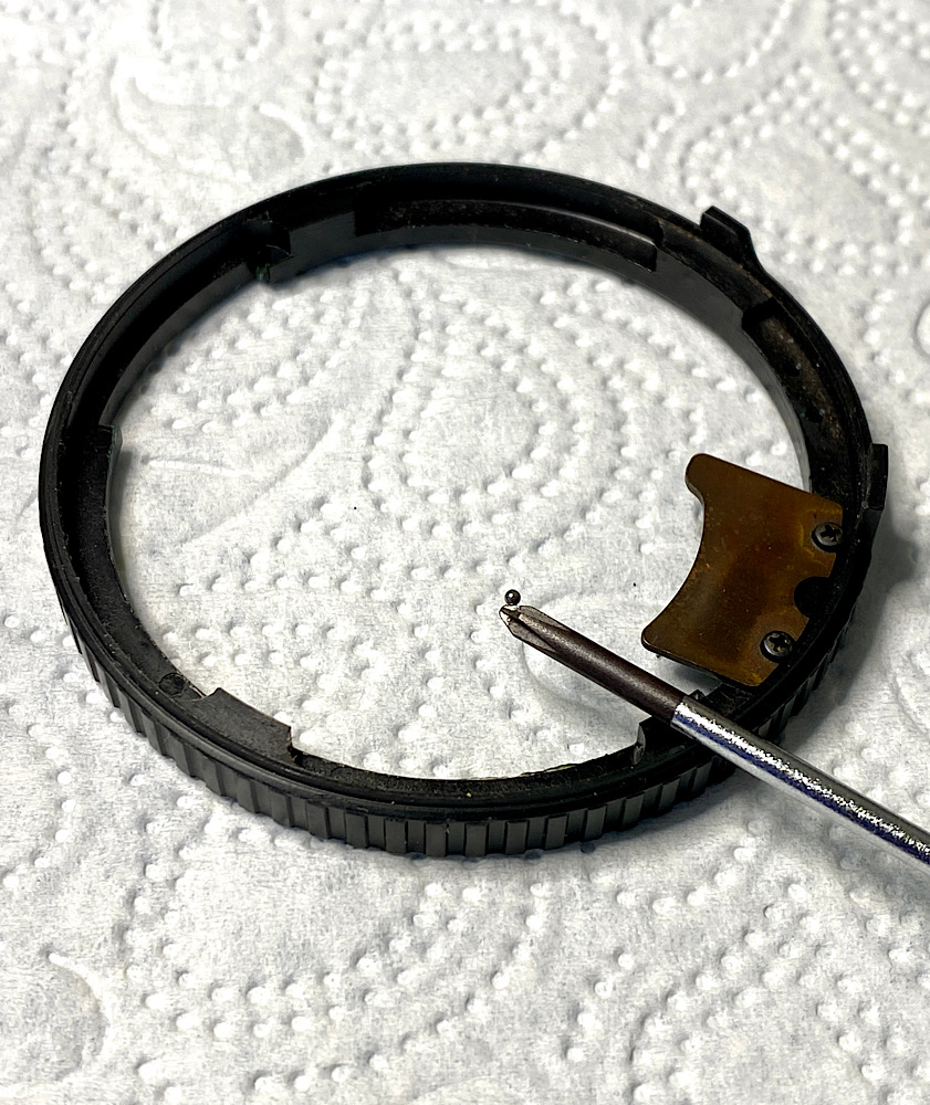 Abnahme des Blendenrings, die Rastkugel ist gesichert, unter dem Ring wieder Öl.