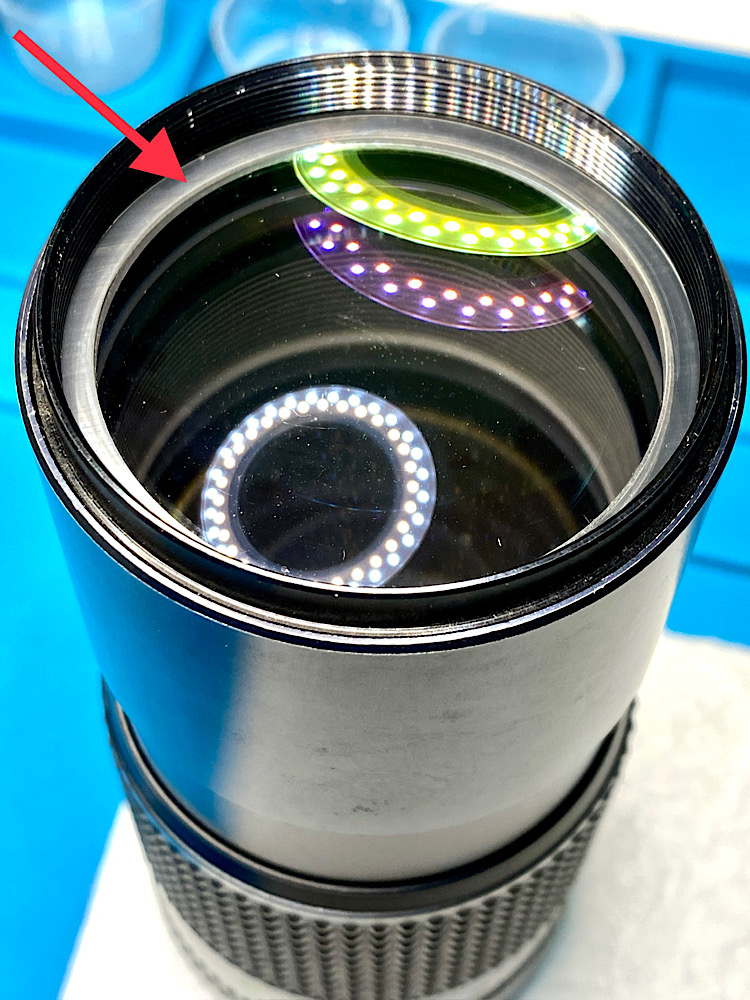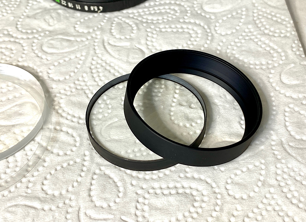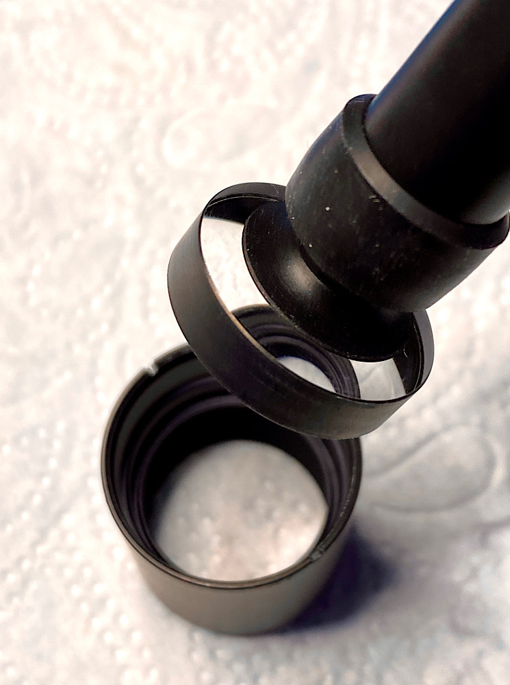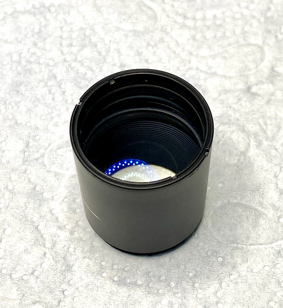 Die Frontlinse trägt zur Schonung einen Kunststoffring, auf den der Gravurenring aufsetzt nach dem Eindrehen.
