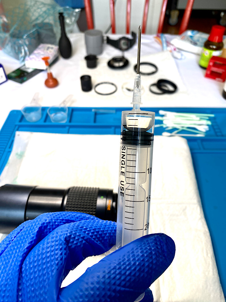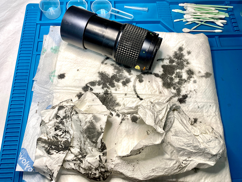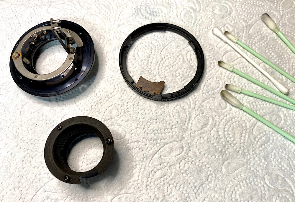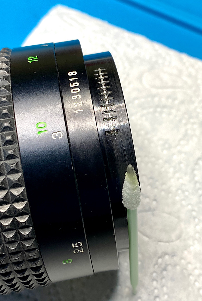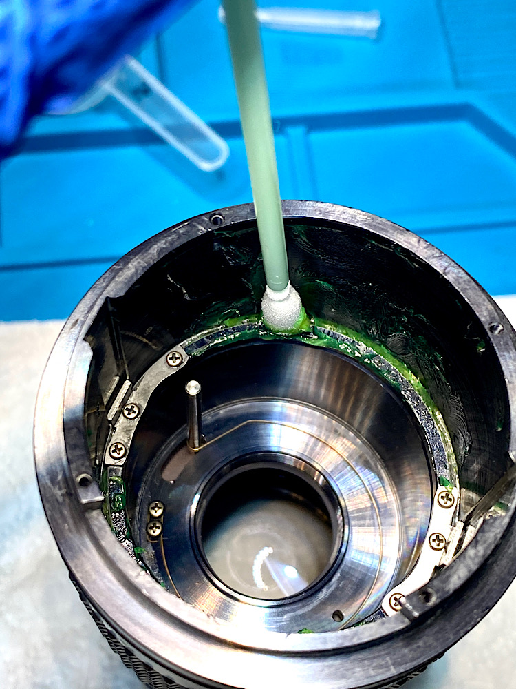 Mehrere Durchgänge mit Sprit und Ein-/Ausdrehen der Helicoide waren notwendig, um die alte Fettung soweit zu entfernen, dass der Fokusring nahezu frei drehte. Allerdings war damit die Schwergängigkeit gegen Unendlich noch nicht behoben.