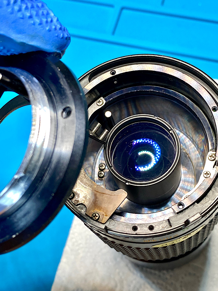 Glücklicherweise lief dabei nichts von der Öl-Benzin-Emulsion in das Blendenregister und auf die verbauten Linsen.