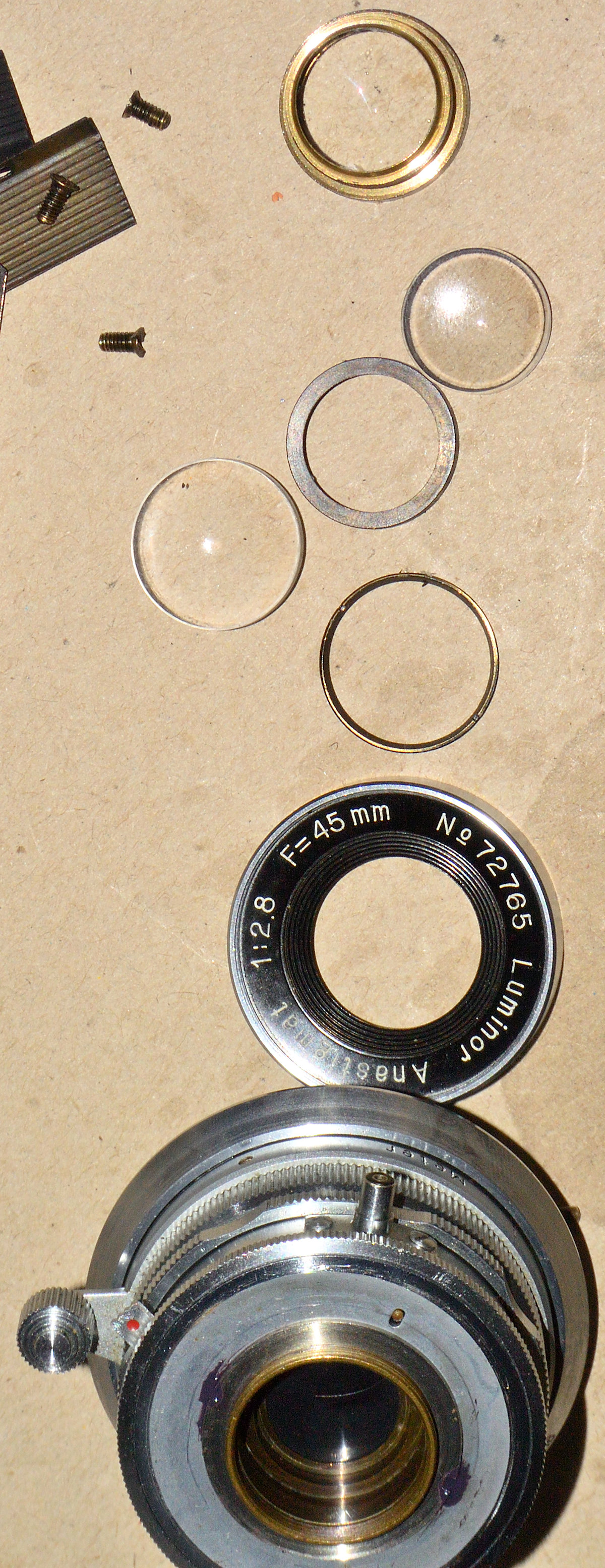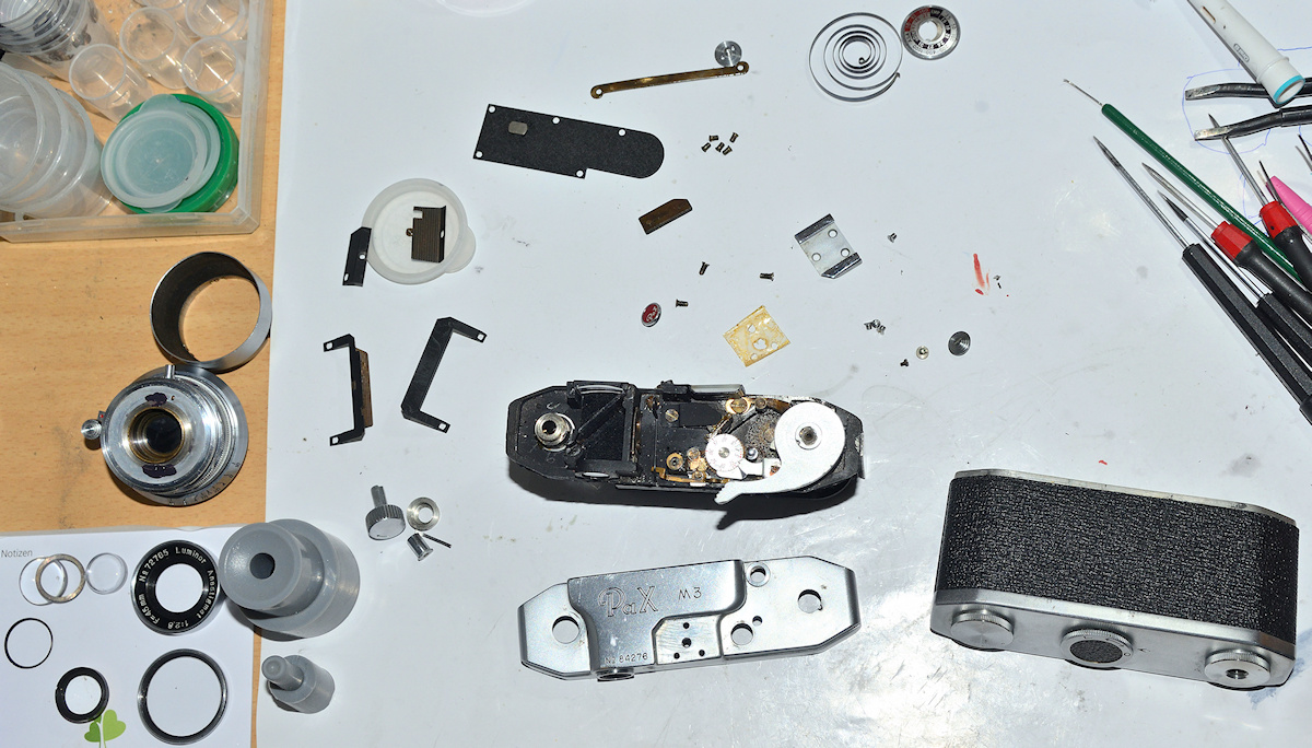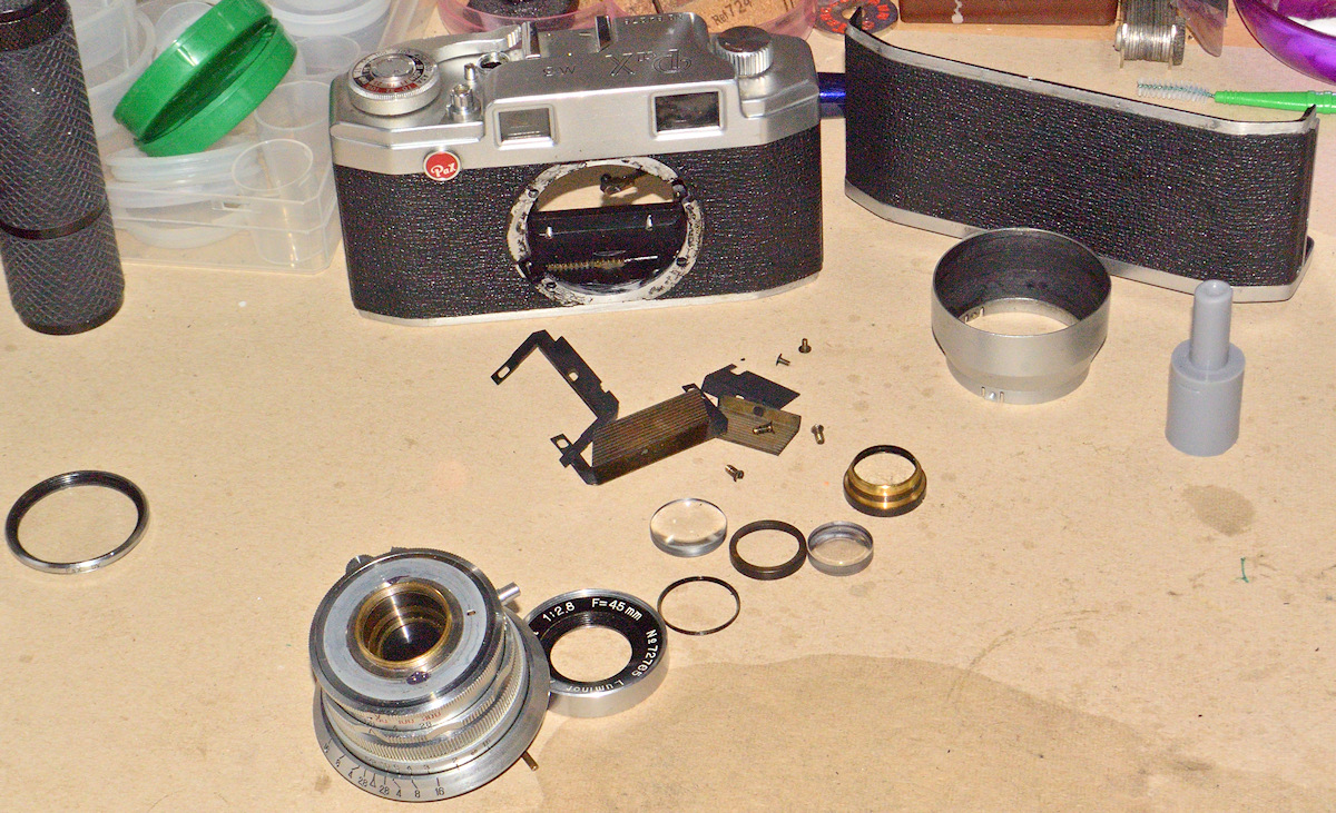 Das Objektiv (Verschluss und Fokuseinstellung) habe ich wieder gängig gemacht, wobei die Fokuseinstellungsreparatur sehr anstrengend war (drei Mal mit Kriechöl geflutet und mit Heißluftgebläse auf über 100°C erhitzt, und mit Ölfilterzangen gedreht), die Linsensätze vor und hinter dem Verschluss ausgebaut und gereinigt und die Blende gereinigt.