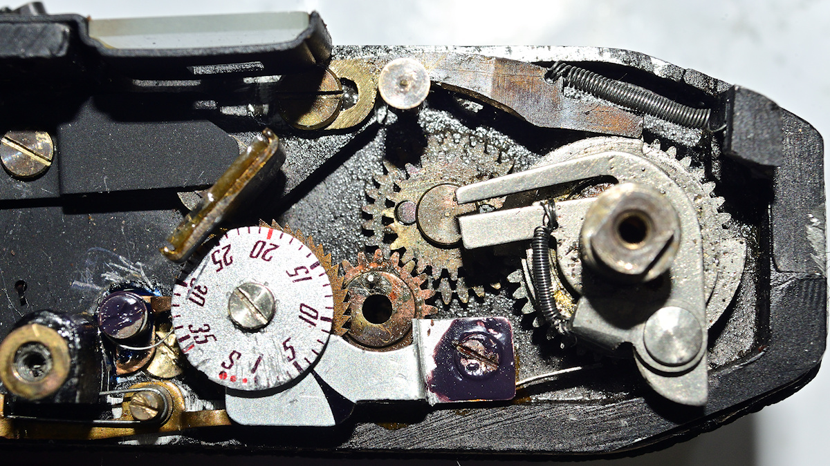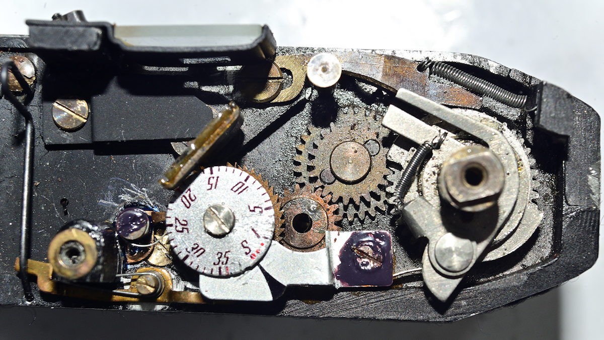 In der Bildmitte sieht man auf dem Zahnrad mit Loch für den Rückspulknopf einen kleinen Buckel, der abgewetzt aussieht.