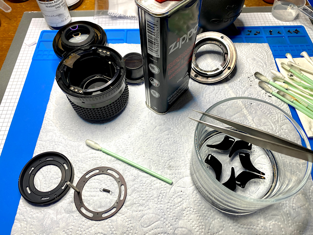 Reinigung des „neuen“ Blendenregisters mit Zippo Feuerzeugbenzin.