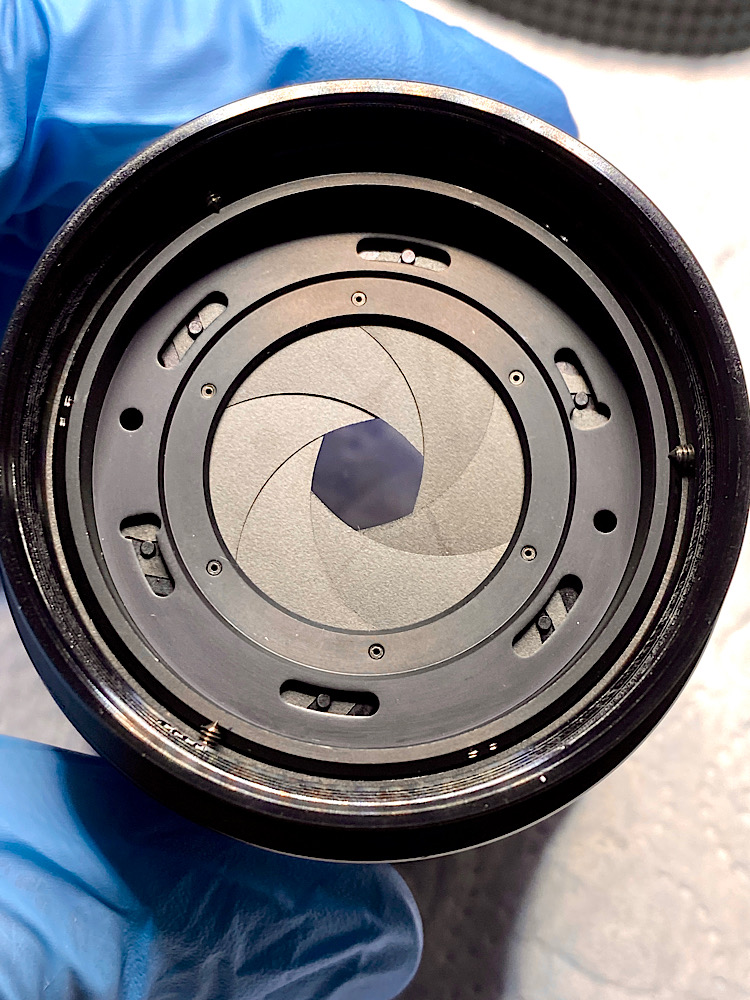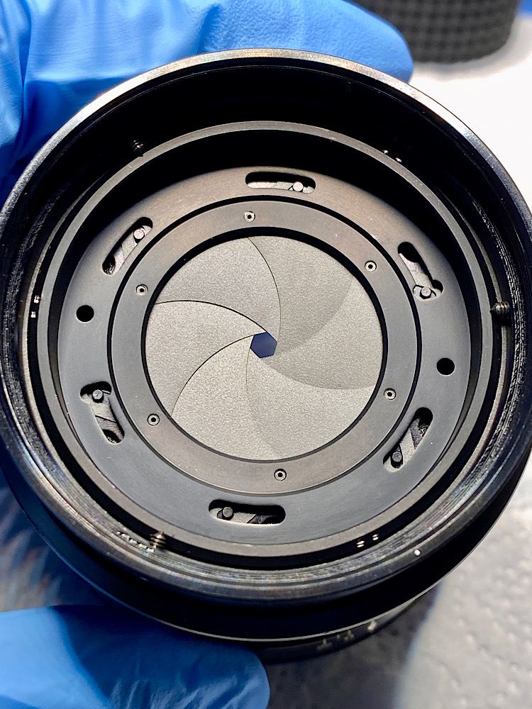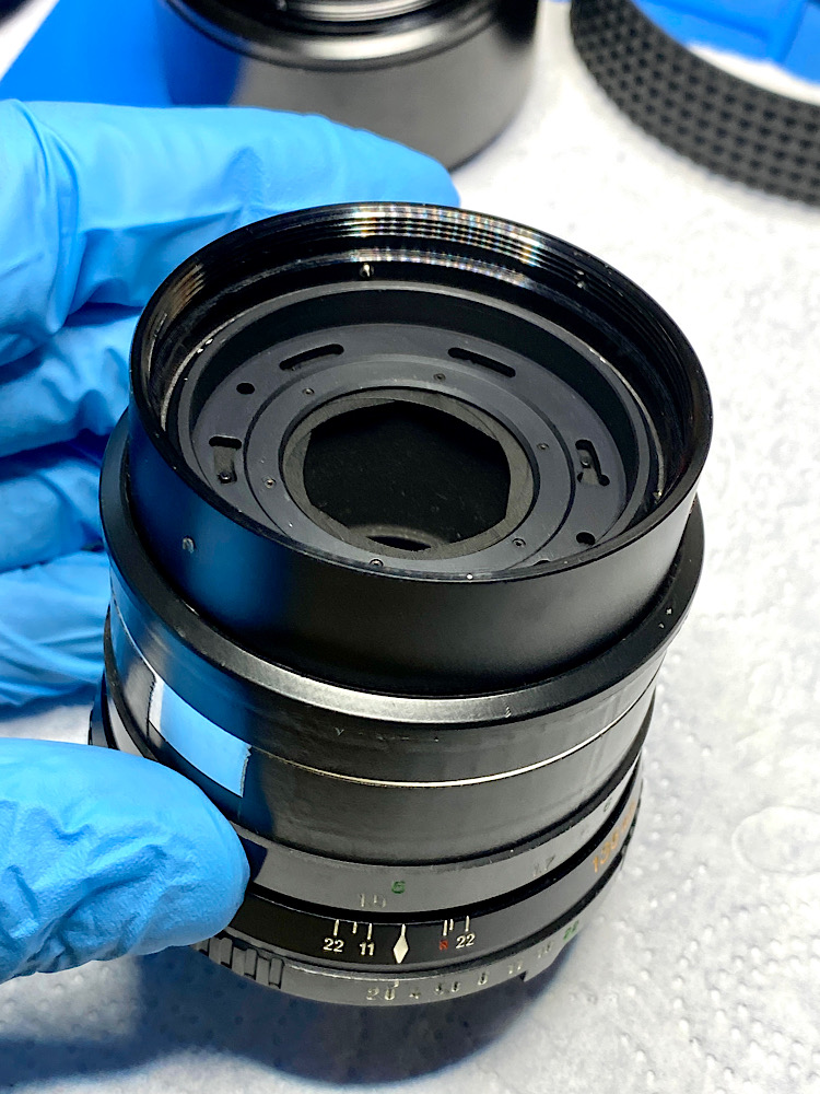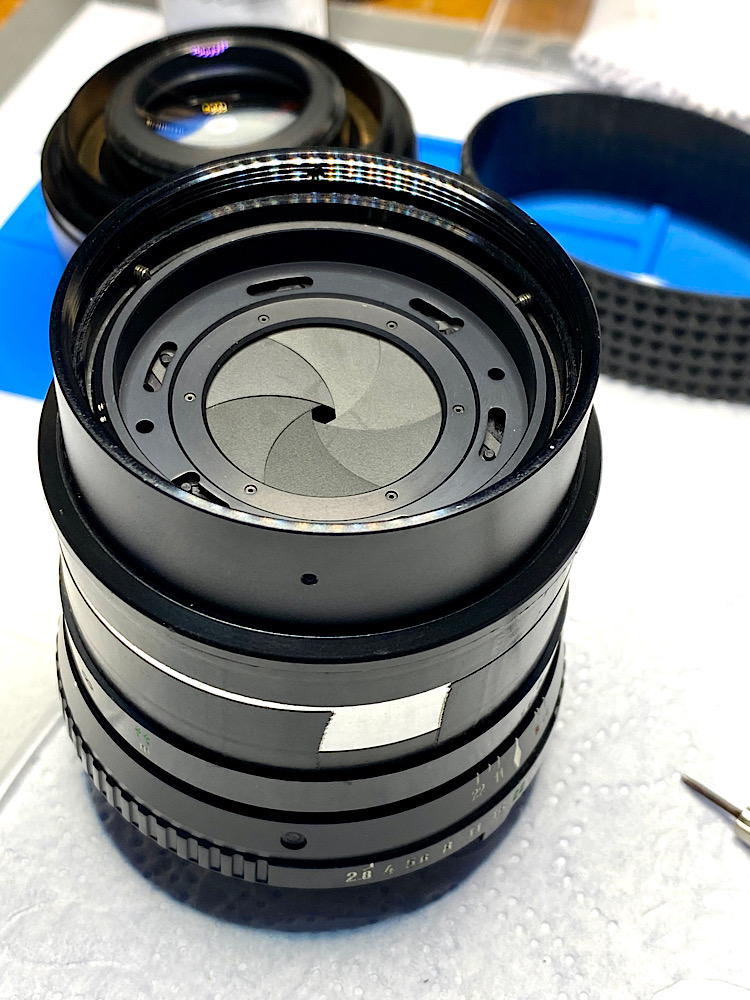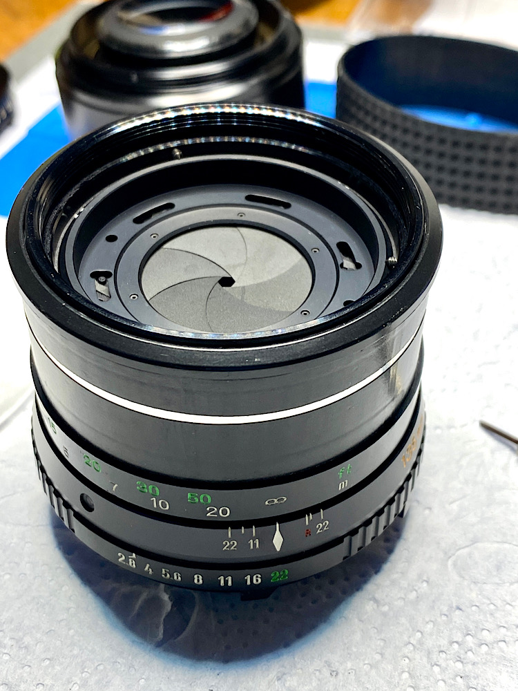 Nach dem Einlöten blieb eine minimale Schieflage, was dazu führte, dass die Blendenöffnung bei ausgezogenem Tubus (Nahdistanz) von der Blendenöffnung bei Unendlich abwich.