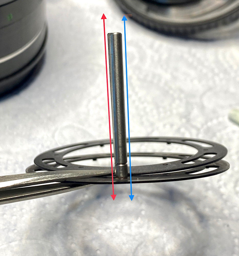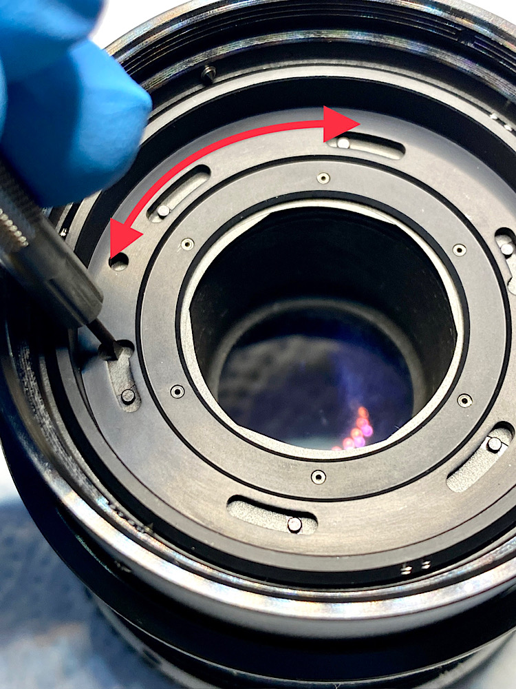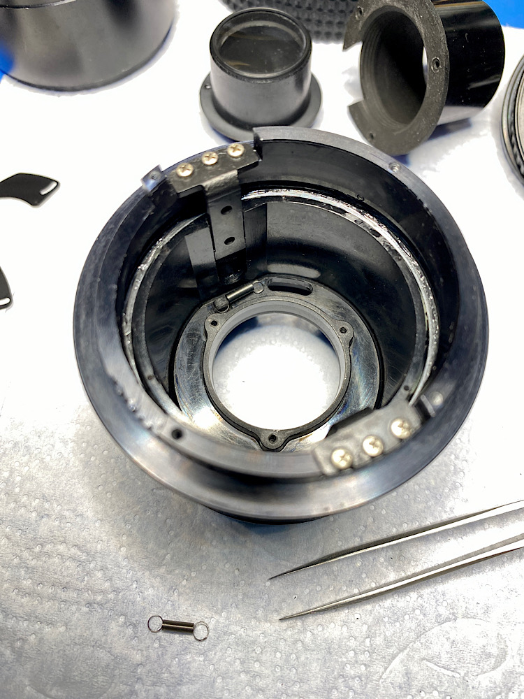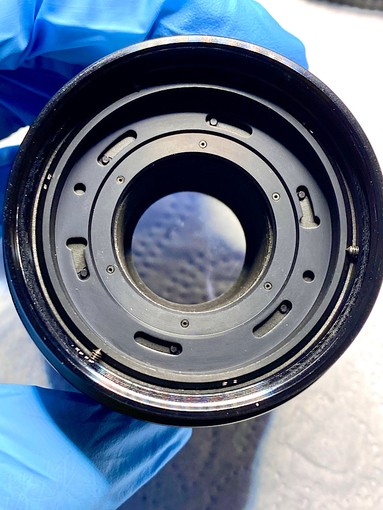 Nach dem Einlöten blieb eine minimale Schieflage, was dazu führte, dass die Blendenöffnung bei ausgezogenem Tubus (Nahdistanz) von der Blendenöffnung bei Unendlich abwich.