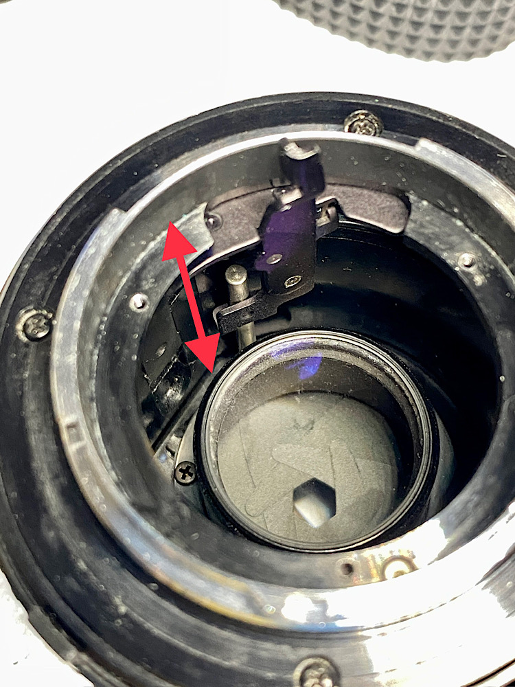 An diesem Hebel gleitet der Mitnehmer des Blendenringes vertikal beim Fokussieren.