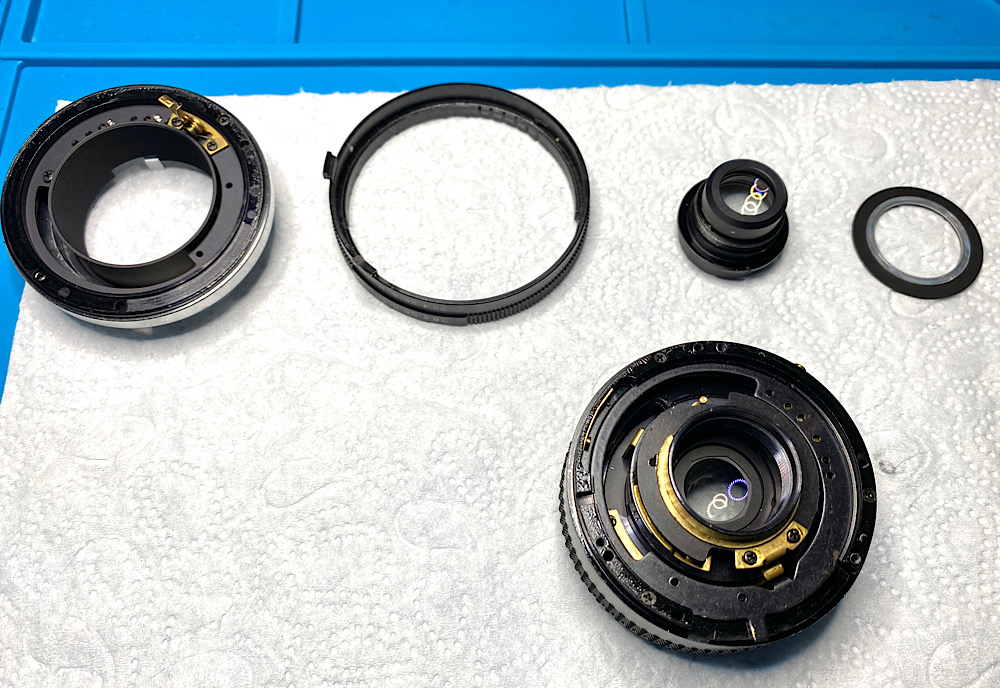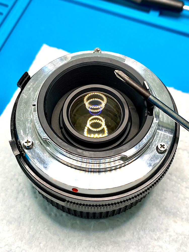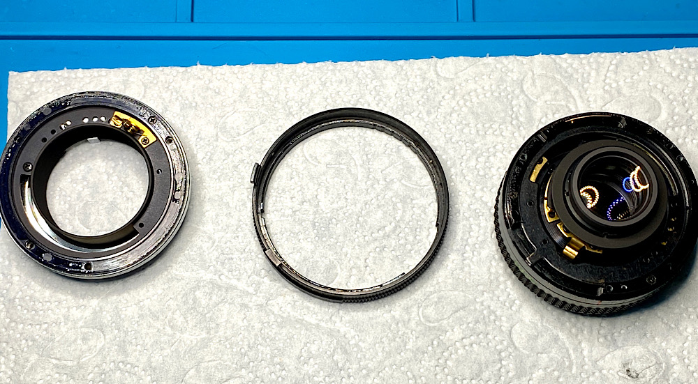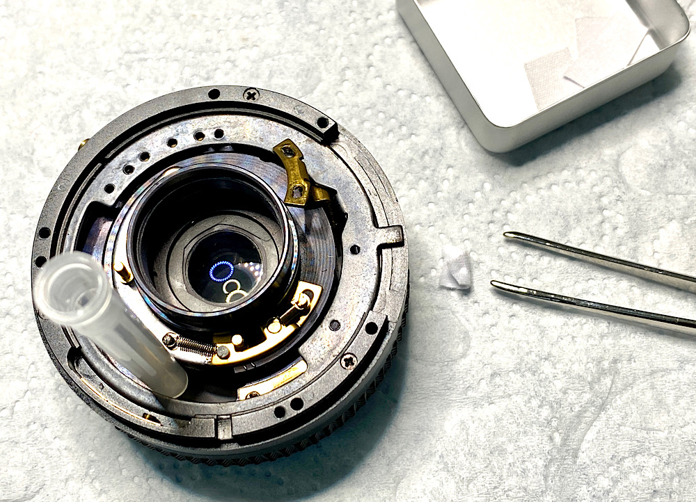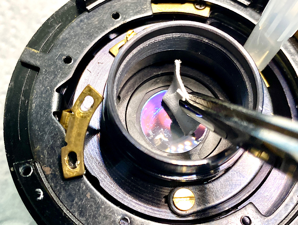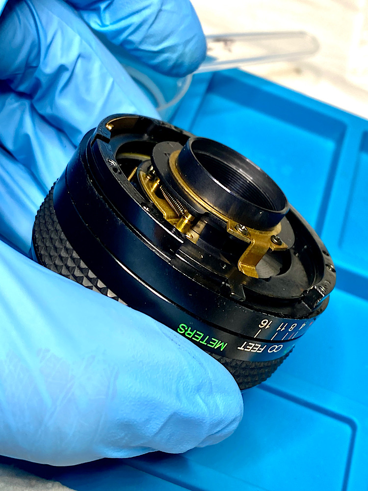 - Zu Öl gewordene Schmierung der Fokusschnecke ist beinahe schon ein Routineproblem bei manuellen Objektiven, die bereits einige Jahrzehnte alt sind.
