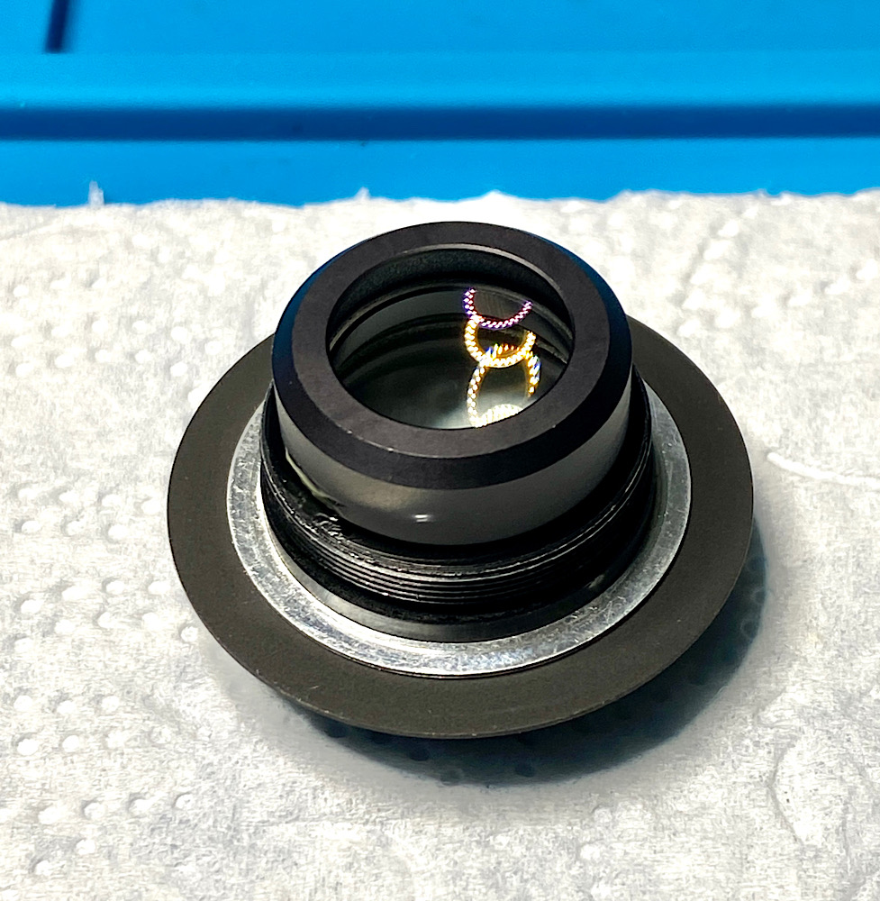 Die Idee, auch die vorderen Linsen auszubauen, um den Tubus komplett in Benzin zu reinigen, gebe ich nach Abschrauben des Gravurenringes auf.