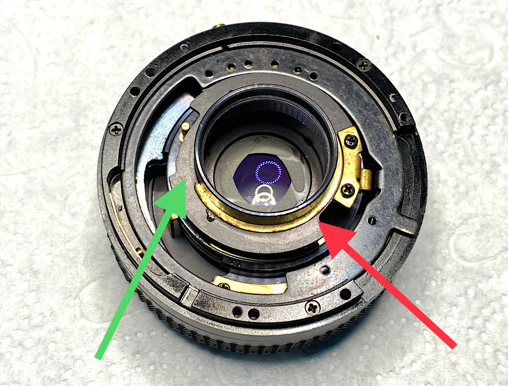 Der Ring mit Steuerkurve zur Bildung der Blenden, die mit dem Blendenring eingestellt werden (GRÜN), wird von einem Haltering aus Messing (ROT) fixiert.