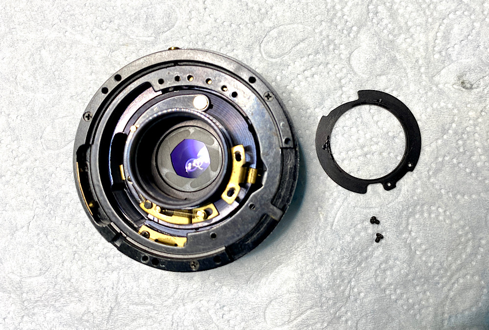 Dazu müssen zwei Schrauben, die die Verbindung zum Blendenring über eine Doppelöse herstellen, gelöst werden.