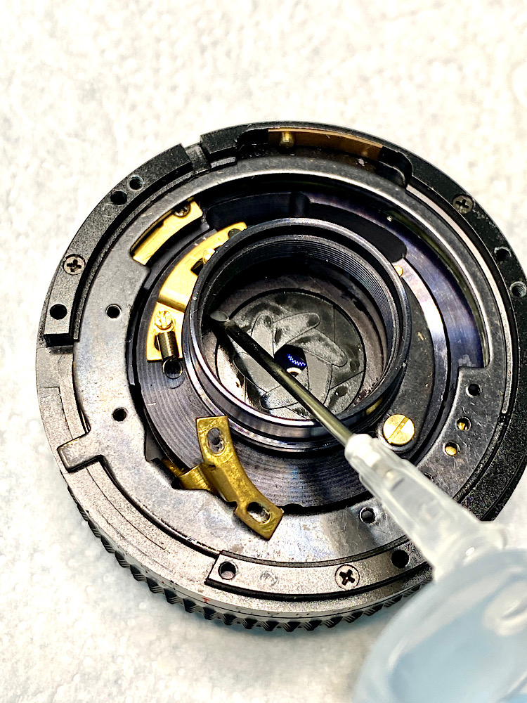 Danach gibt es für die Raste, über die die Rastkugel für die Blendenwerte läuft, eine leichte Schmierung.