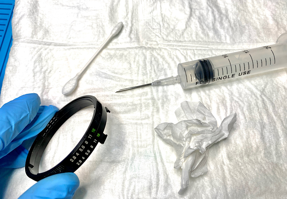 Für das verölte Blendenregister gibt es Zippo Feuerzeugbenzin aus der Spritze.