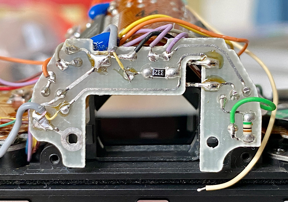 - Die Verlötungen sind - geht man nach dem Baujahr der Kamera und dem Glanz der Lötstellen - mit bleihaltigem Lot vorgenommen worden. Es empfiehlt sich daher, ebenfalls mit solchem Lot zu arbeiten, um allfällige Probleme beim Mischen zweier Lotarten (unterschiedliche Schmelzpunkte) zu vermeiden.