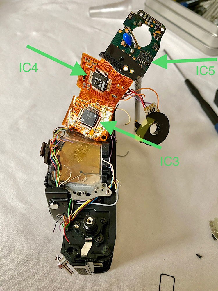 Minolta X-700: LED- und Auslöseproblem, Kondensator- und IC-Positionen